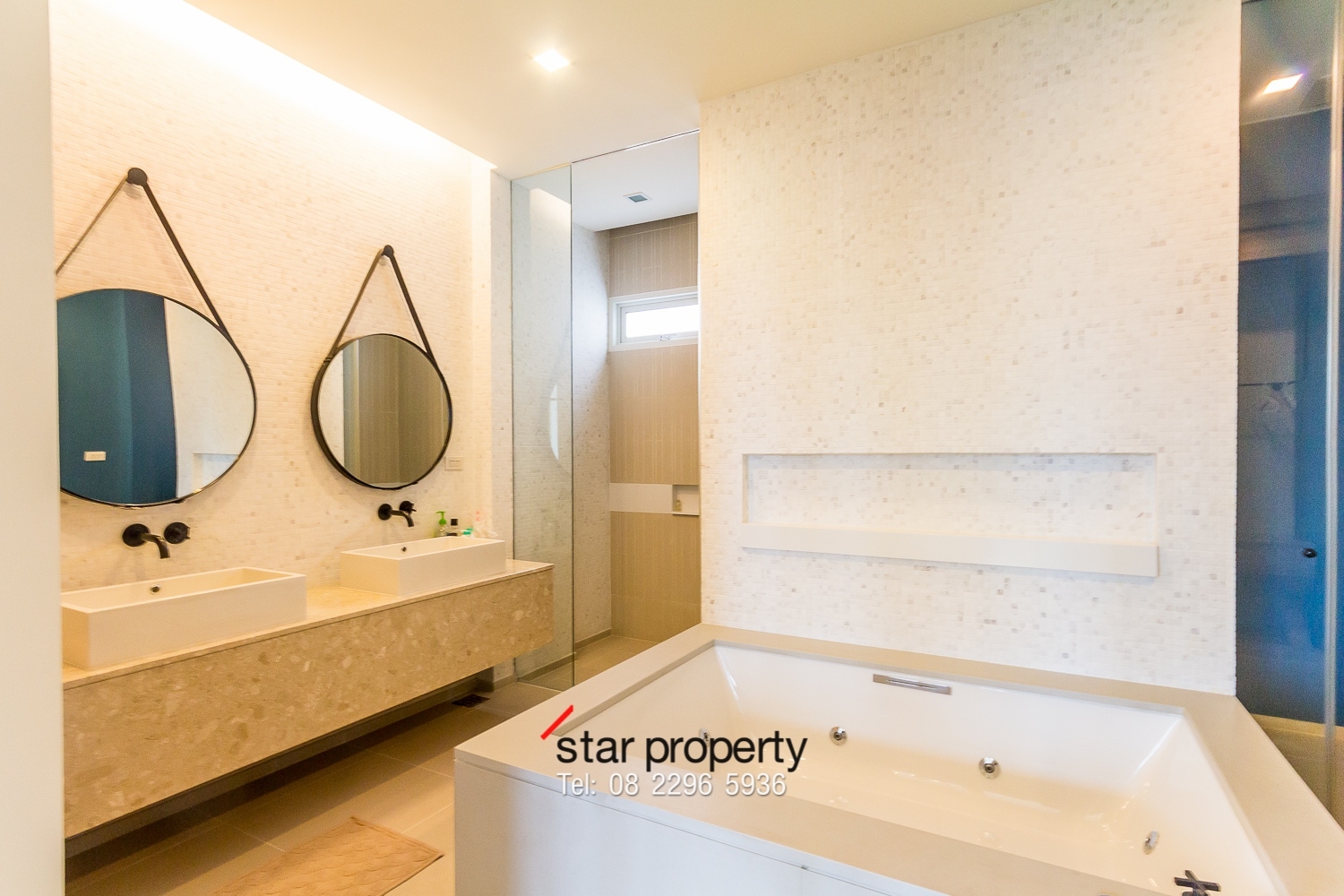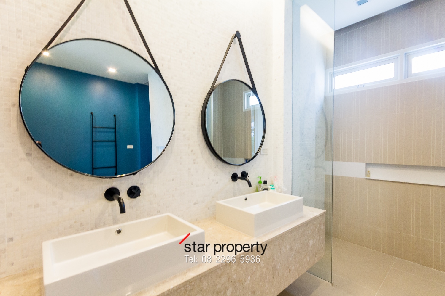 4 bedroom, 5 bathroom, kitchen, and a great living room. The room is fully furnished with modern style furniture.