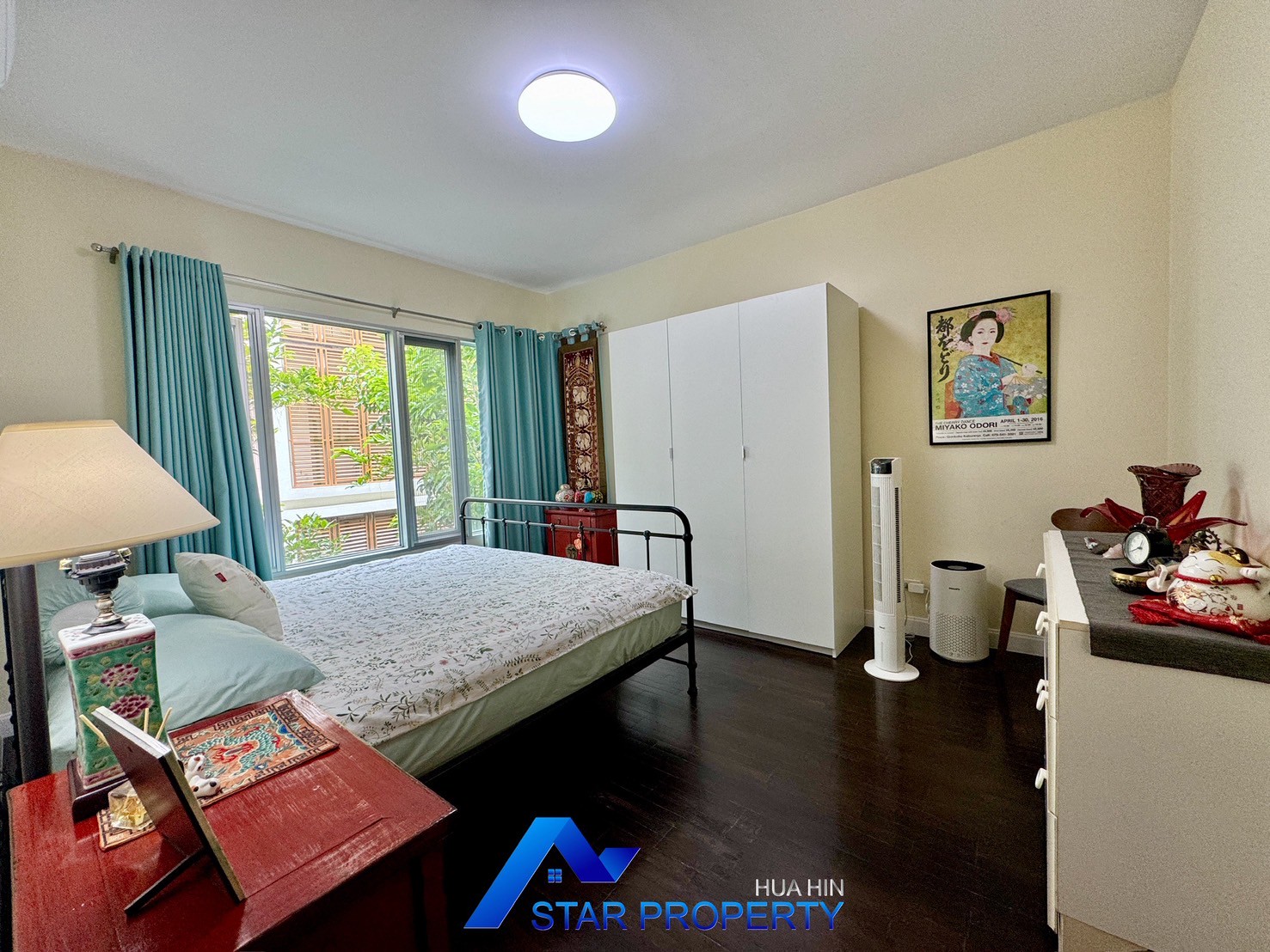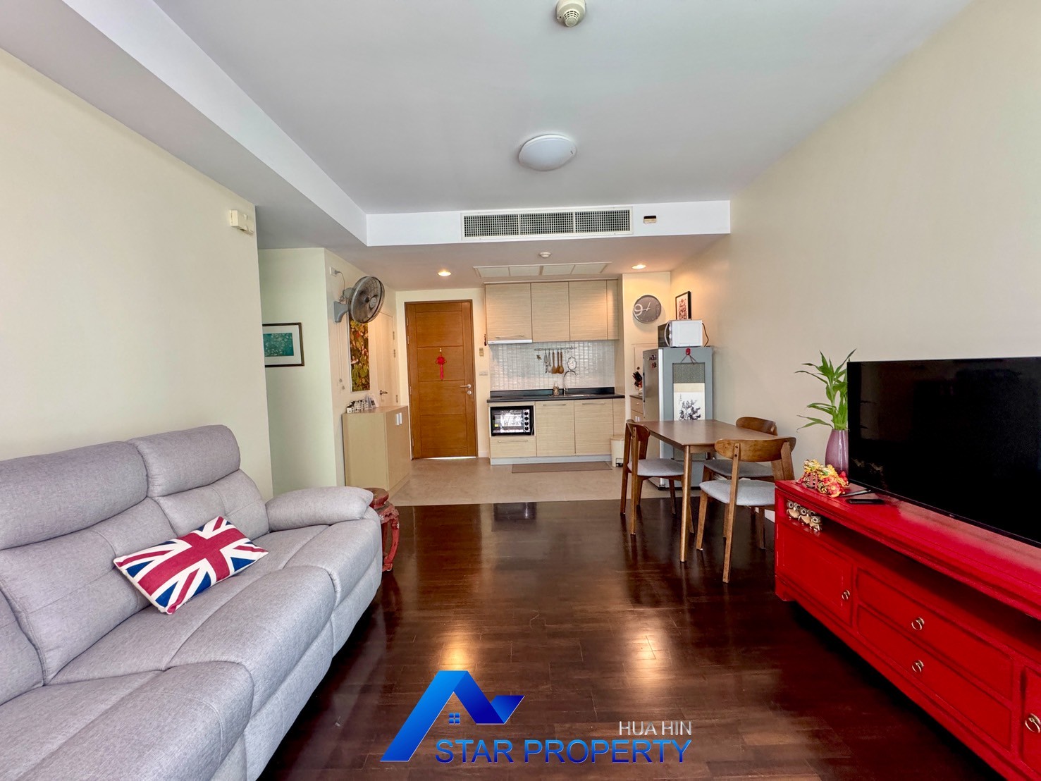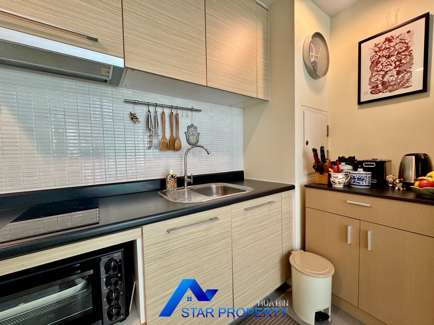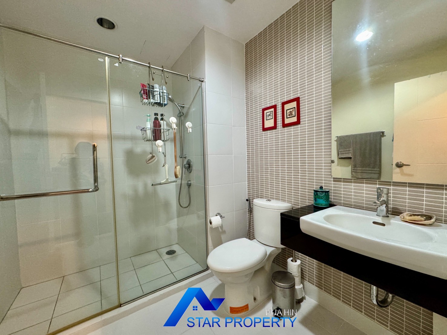 Condominium in the heart of the city, opposite Market Village shopping mall. Not many units, total 93 units. Direct access to the most beautiful beach in Hua Hin. This corner unit consists of 2 bedrooms and 2 bathrooms, fully furnished ( except personal stuff and some pieces of decoration, 2nd floor, usable area 74 sq.m. Open living/dining/kitchen area with sliding doors to a private balcony with garden and tree views on the left. This property is not to be missed!!