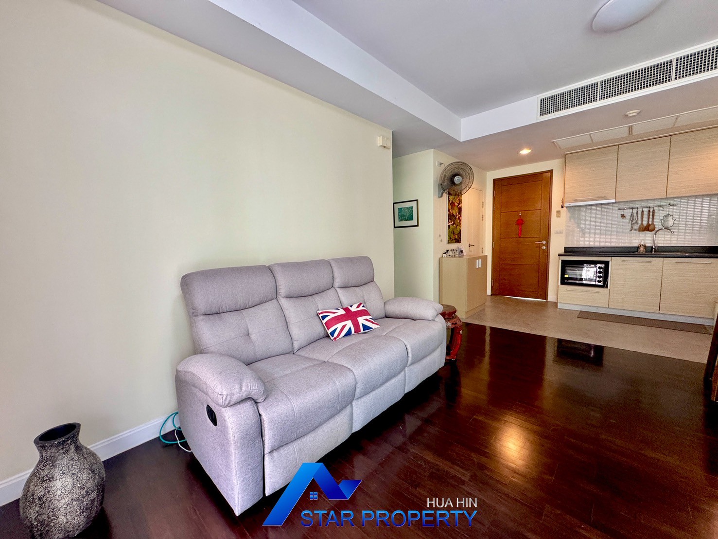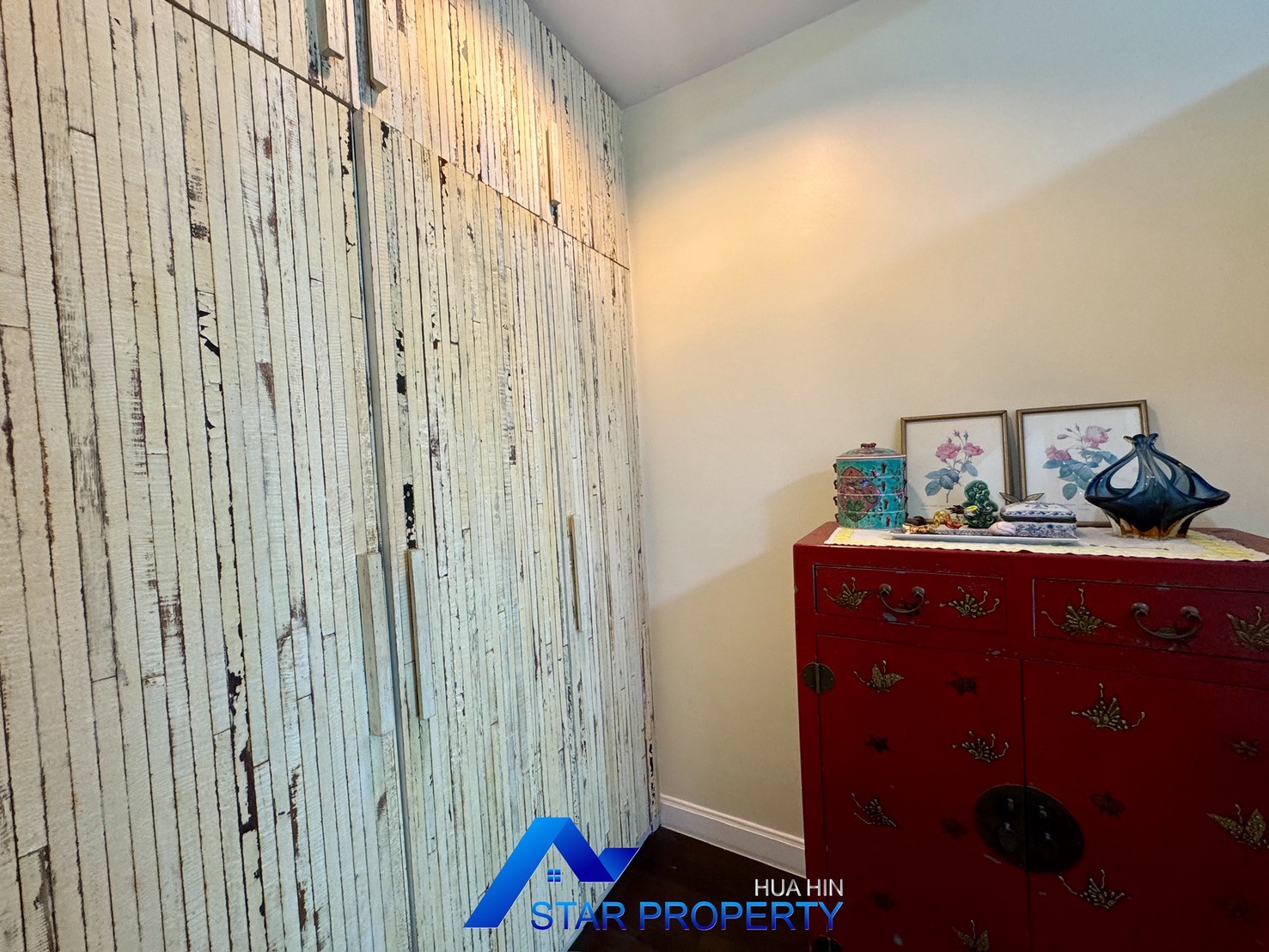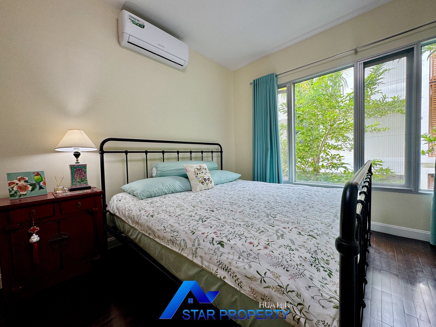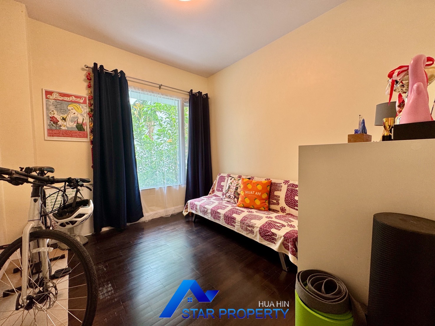 Condominium in the heart of the city, opposite Market Village shopping mall. Not many units, total 93 units. Direct access to the most beautiful beach in Hua Hin. This corner unit consists of 2 bedrooms and 2 bathrooms, fully furnished ( except personal stuff and some pieces of decoration, 2nd floor, usable area 74 sq.m. Open living/dining/kitchen area with sliding doors to a private balcony with garden and tree views on the left. This property is not to be missed!!