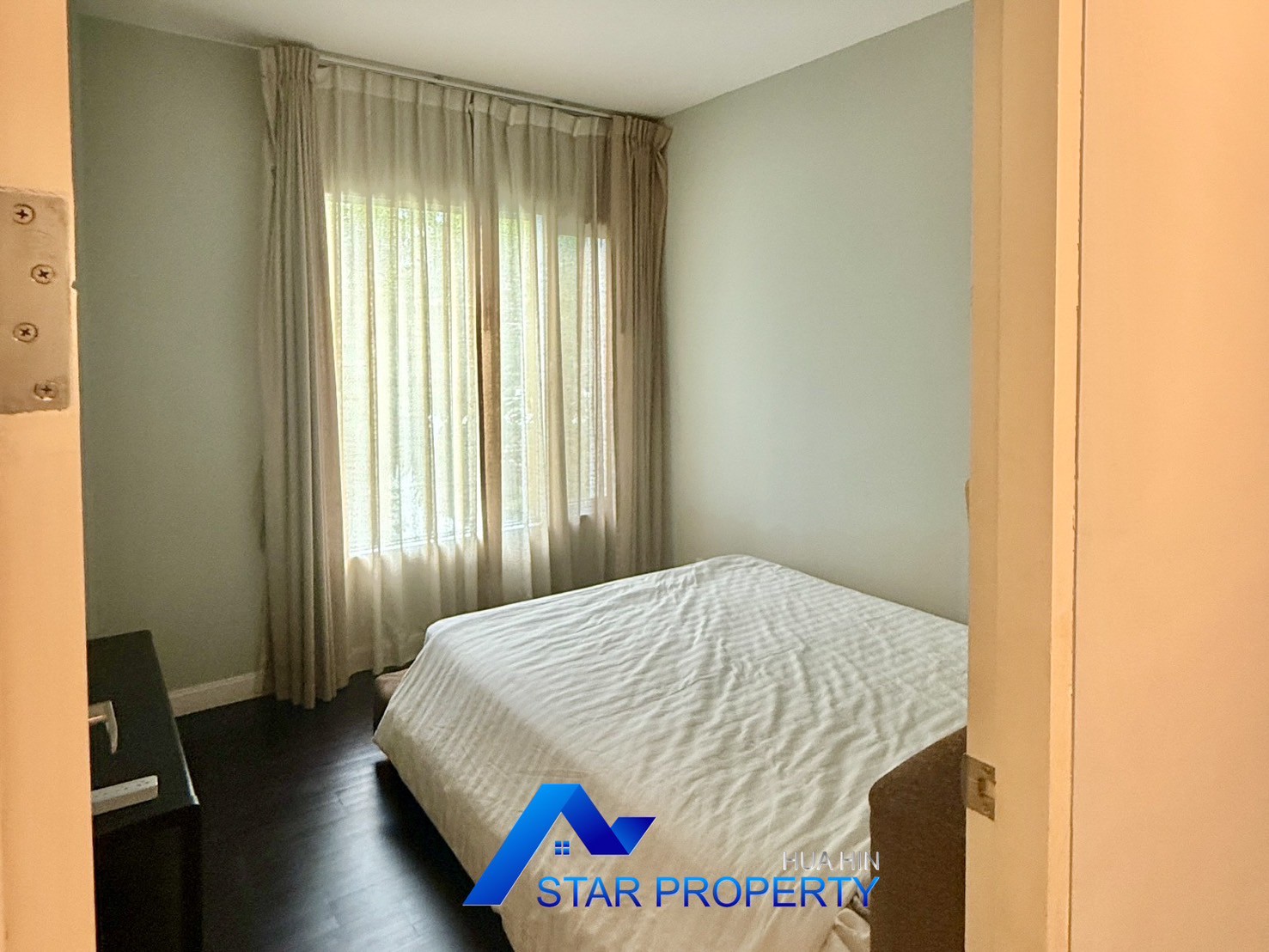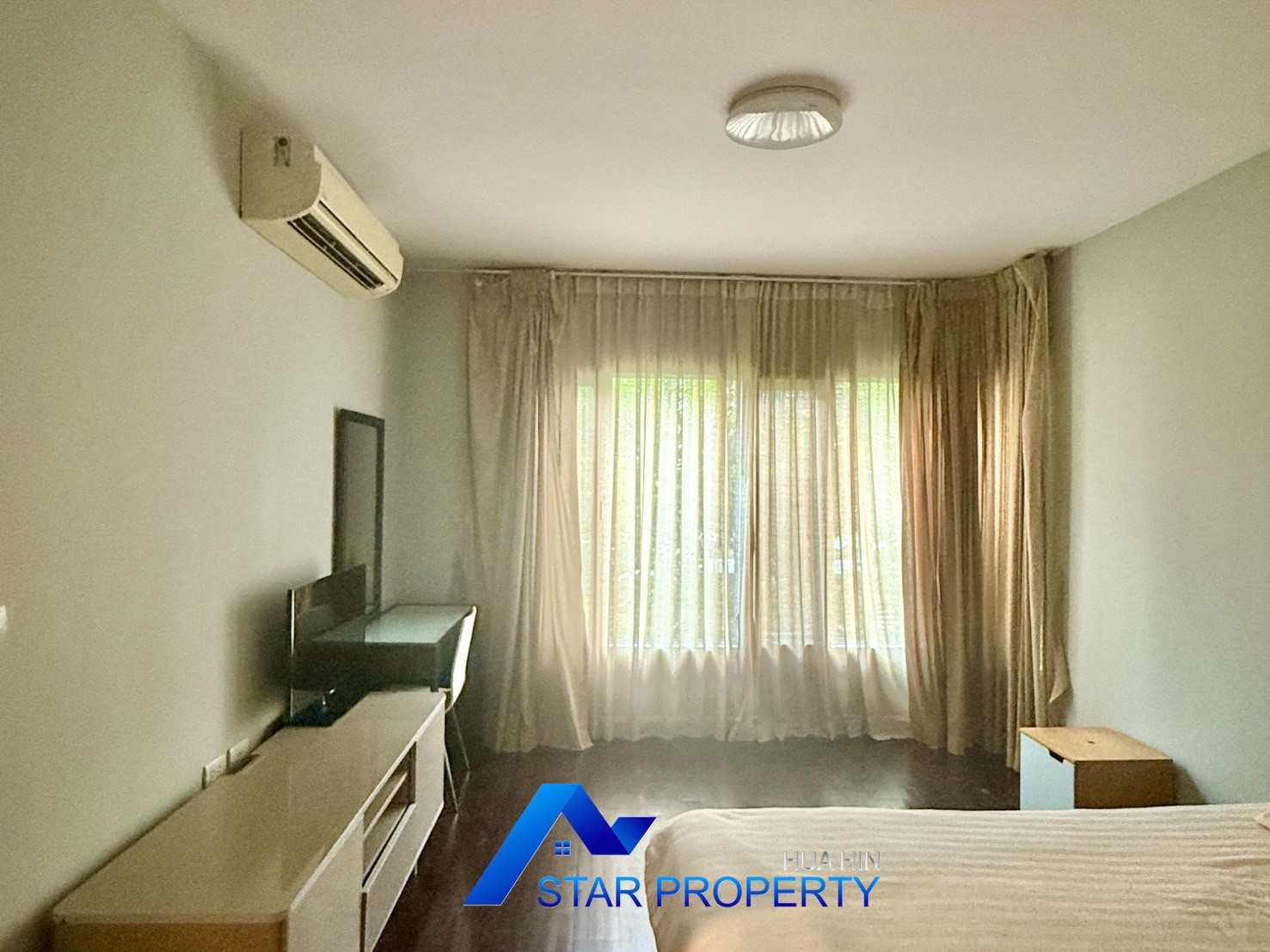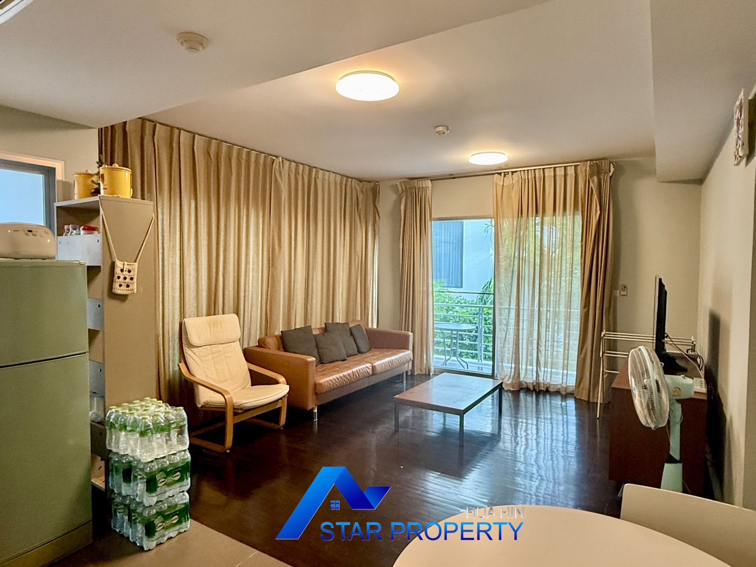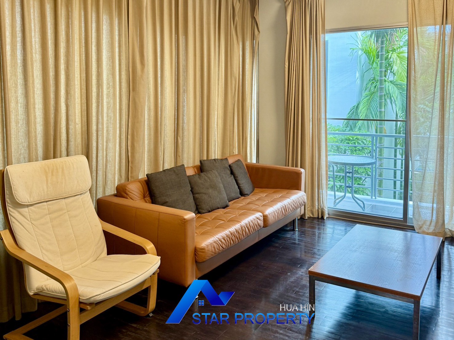 Condominium in the heart of the city, opposite Market Village shopping mall. Not many units, total 93 units. Direct access to the most beautiful beach in Cha-am. This corner unit consists of 2 bedrooms and 2 bathrooms, fully furnished, 2nd floor, usable area 75.34 sq.m. Open living/dining/kitchen area with sliding doors to a private balcony with garden and tree views on the left. This property is not to be missed!!