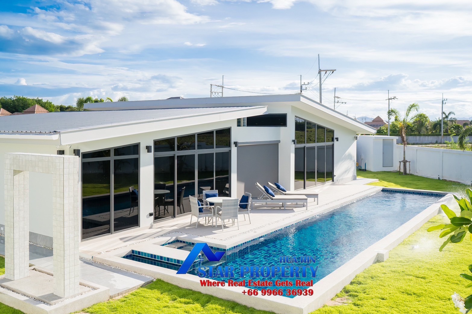 Nestled within a small and exclusive residential enclave off Soi 112, in close proximity to the picturesque Pineapple Valley Golf Course, awaits a contemporary luxury estate – a 3-bedroom, 2.5-bathroom villa exuding modern elegance and luxurious comfort. Newly completed in 2022, this villa has been meticulously upgraded by the current owner, boasting exquisite textures, including a stunning wood ceiling in the entrance and living room, and an expanded terrace/pool area, among other enhancements.