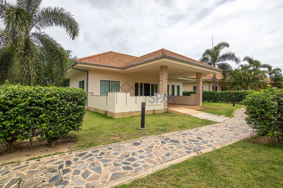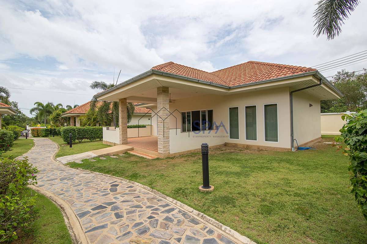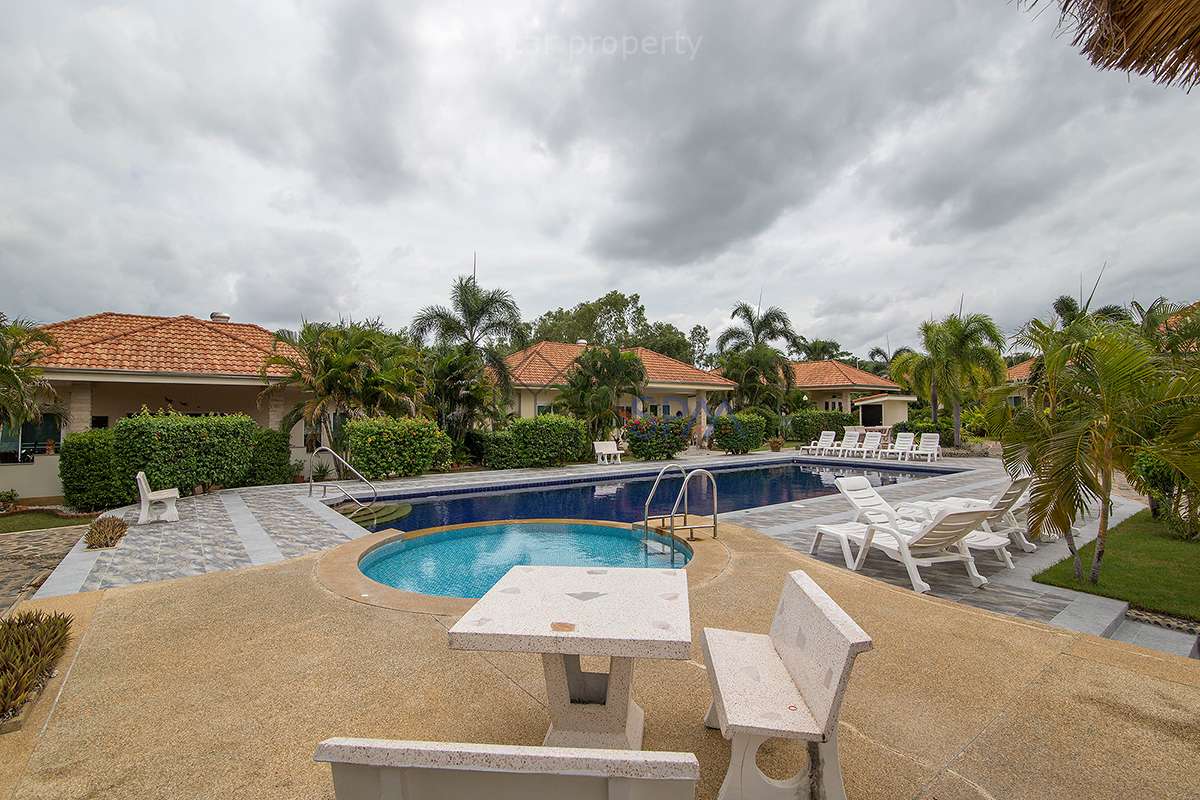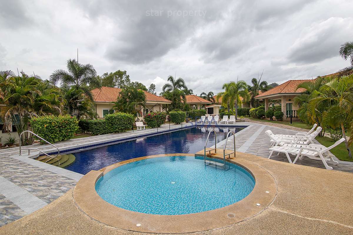 This house has 2 bedrooms and 2 bathrooms. The property has been built on a beautiful plot located in the countryside, 7 minutes drive outside Hua-Hin city. In the design of this house, lots of bright colored materials and fabrics were used to create a feeling of space and comfort. There is a communal swimming-pool and jacuzzi. The whole village is surrounded by a wall. No strangers are allowed in the village, making it perfectly safe. In the area are several golf courses, amusement parks, restaurants, markets, and other attractions. The nature is luxuriant with full of exotic trees and flowers. Hua-Hin’s famous nightlife is also nearby.