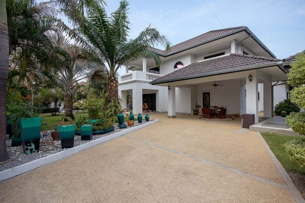 This house has covered parking . The neatly trimmed tropical garden hugs the entirety of the property.