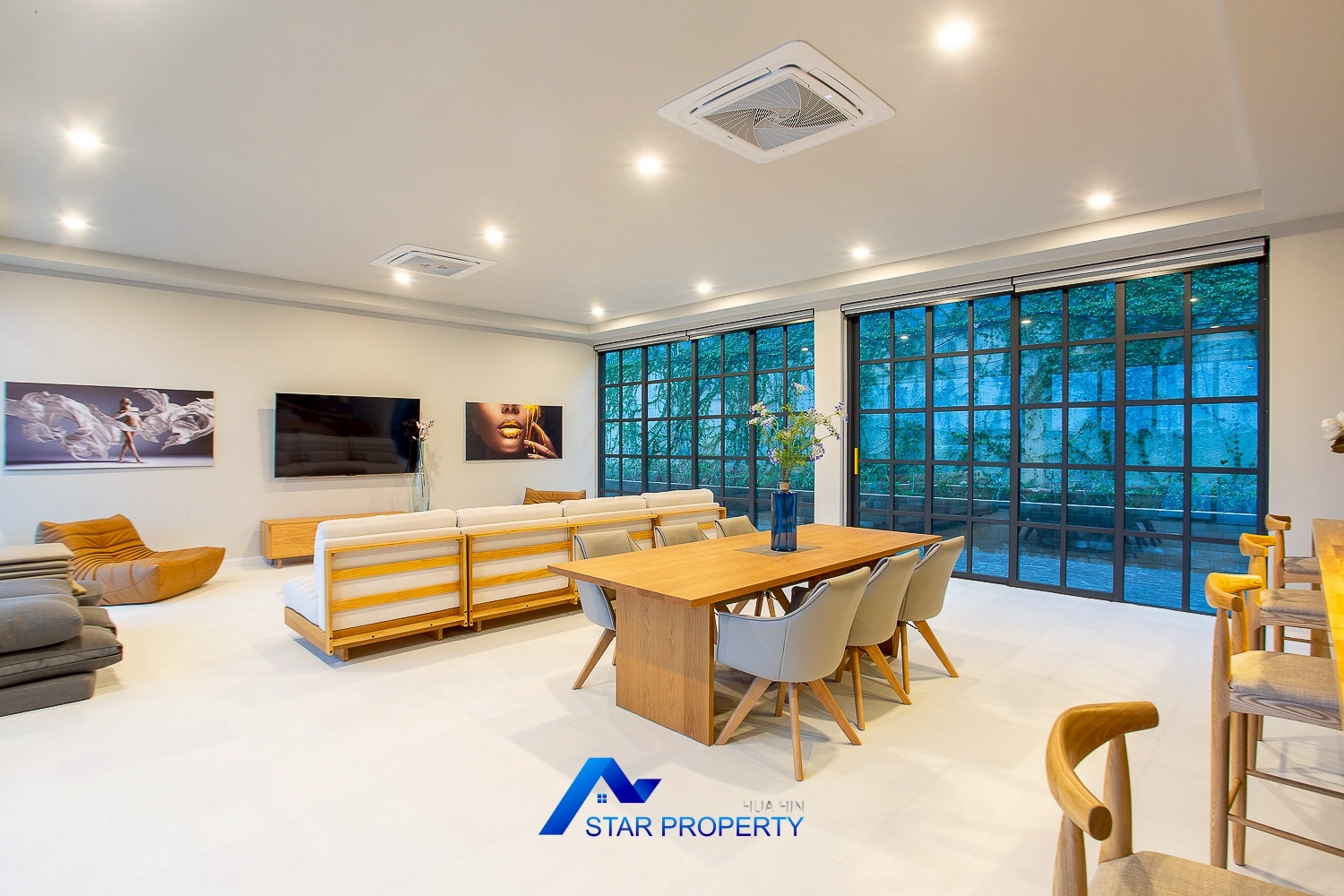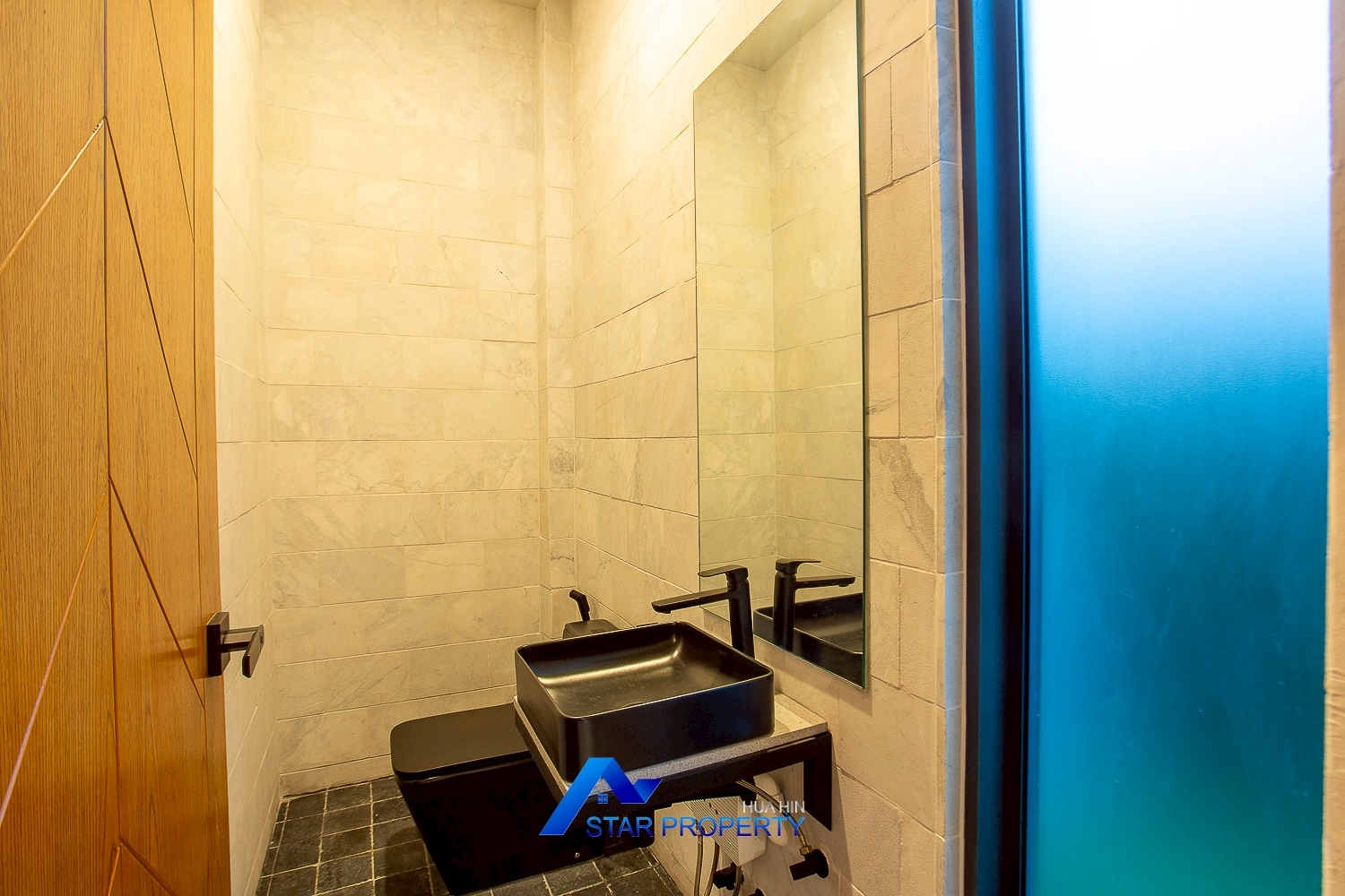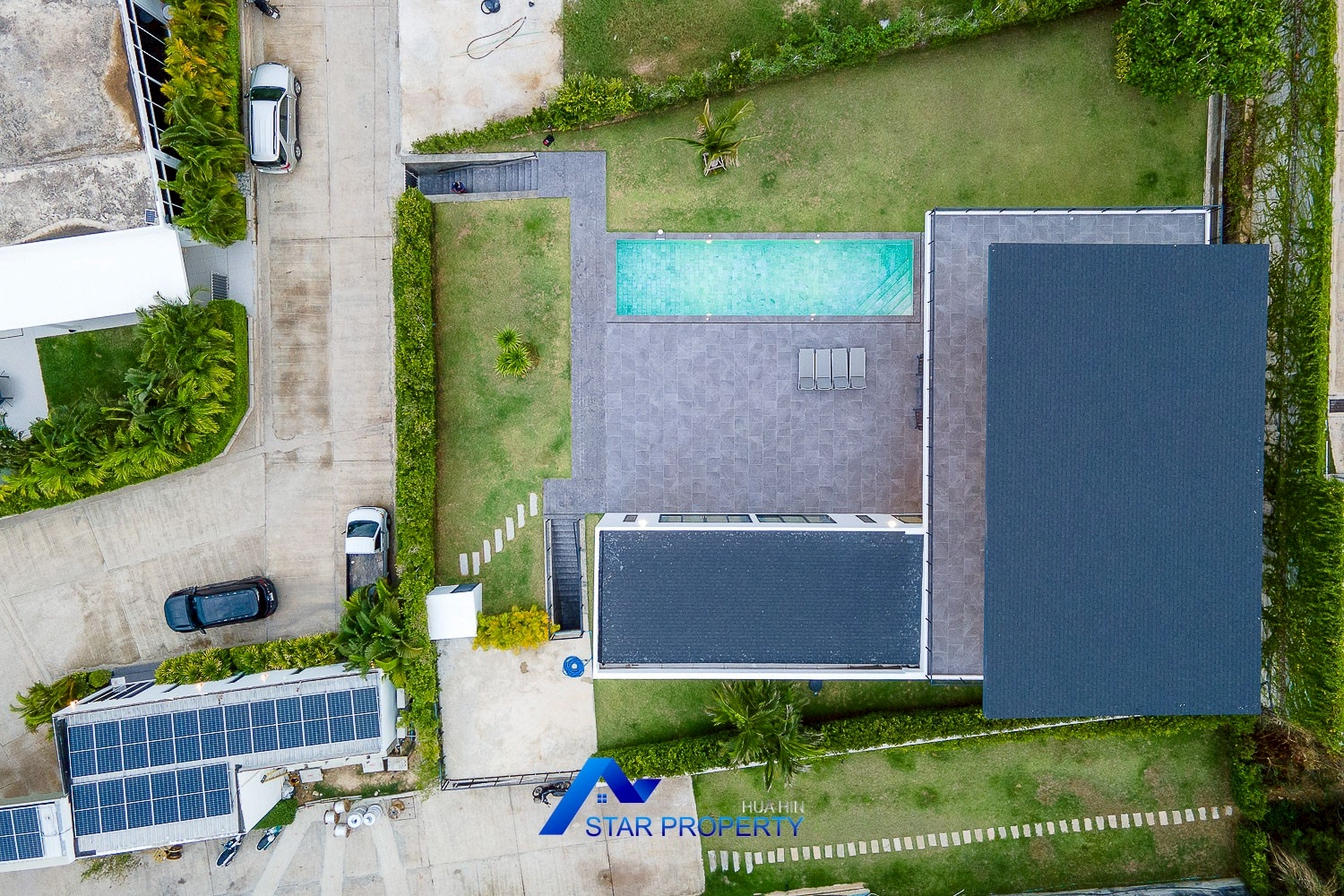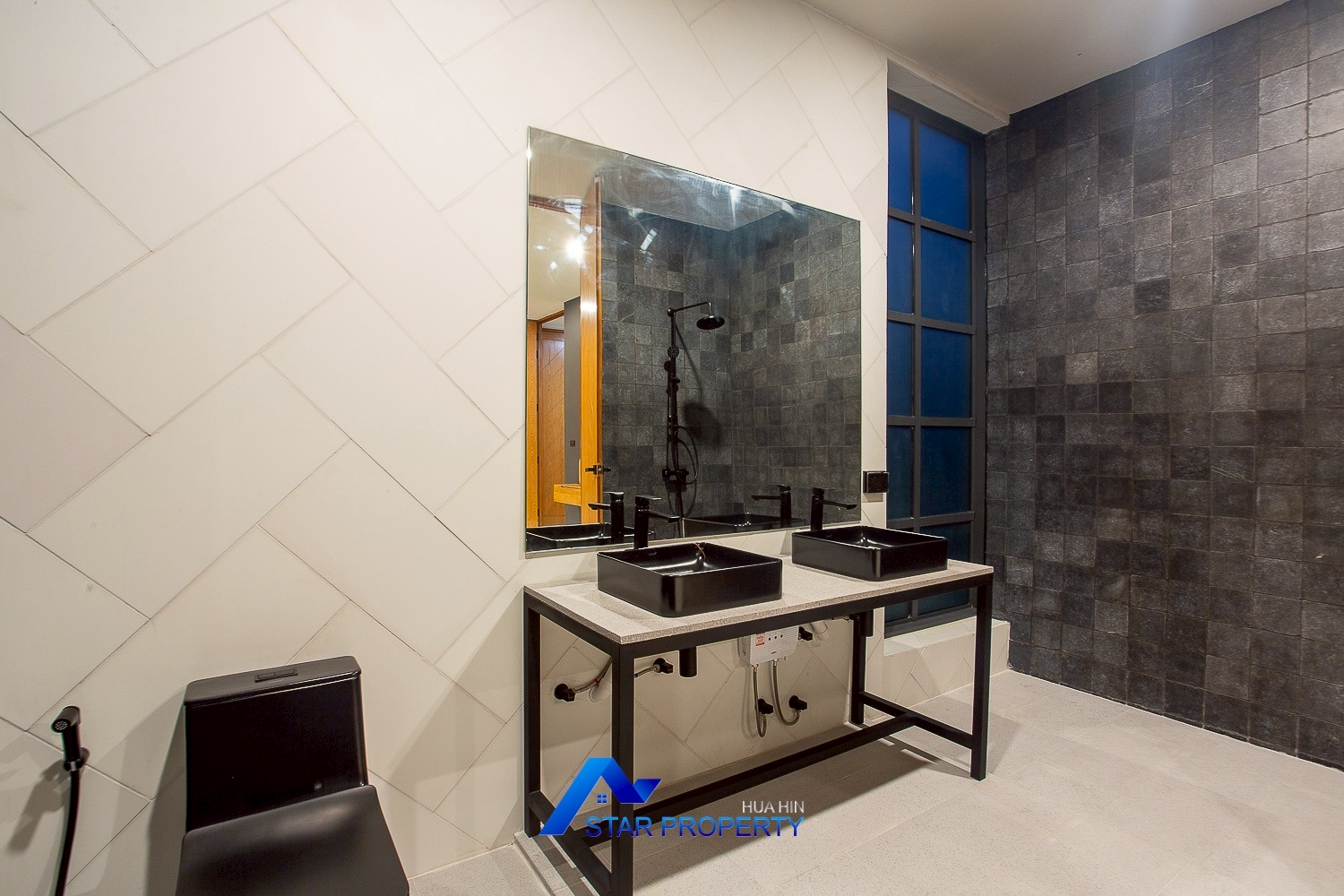 This villa offers a similar unique design which has been enhanced to offer 5 bedrooms, set over 2 storeys and is ideal for owners that need more space and more bedrooms along with a larger pool. The villa has a roof terrace included and continues the theme of an open plan living area with natural airflow and a modern designed kitchen. Located in Soi 126 and is just a short drive to the beautiful beaches of Khao Tao. The location provides easy access to the south of Hua Hin and is only a 10 minutes drive to Hua Hin centre, Bluport and True Areena.