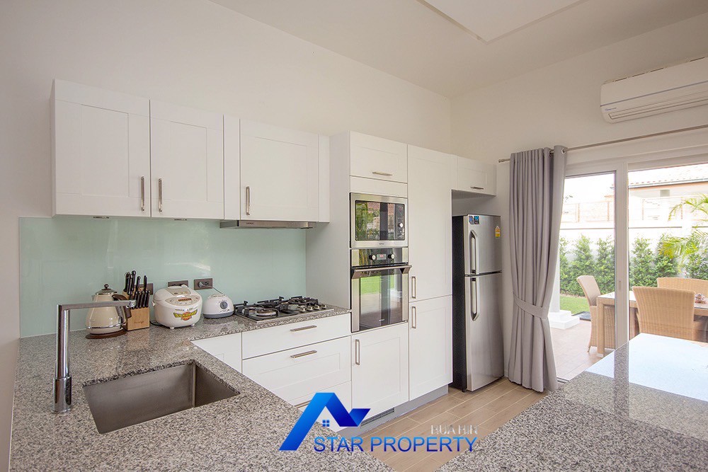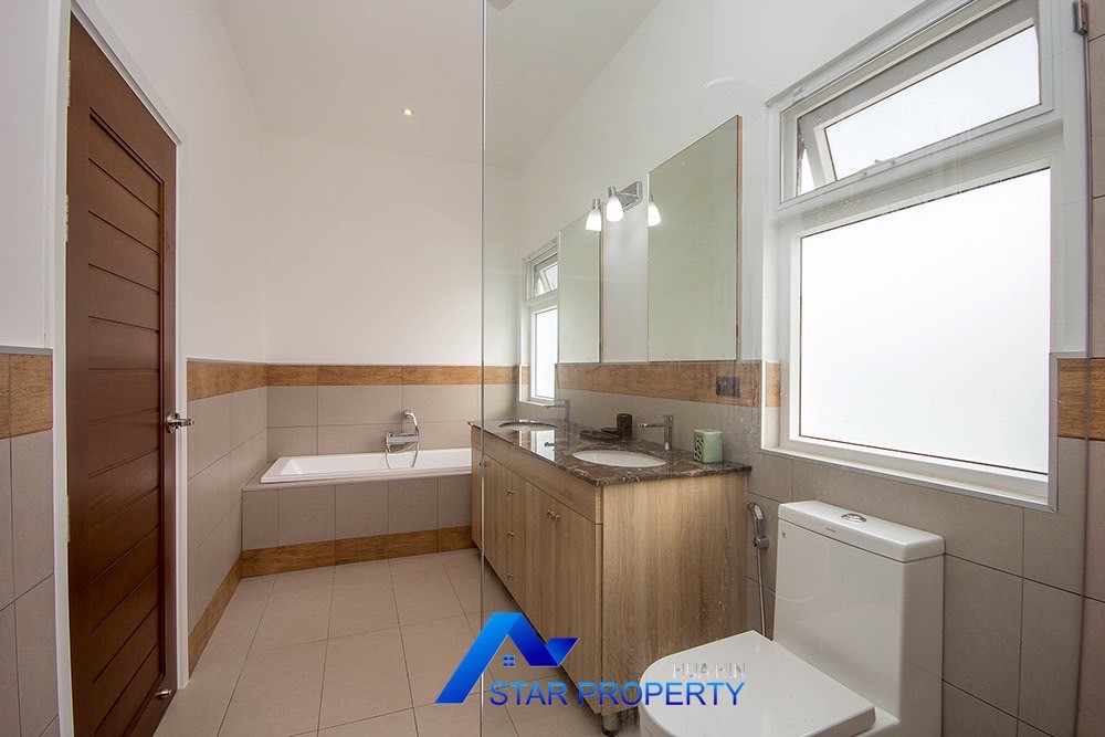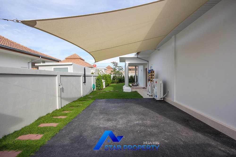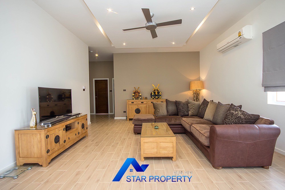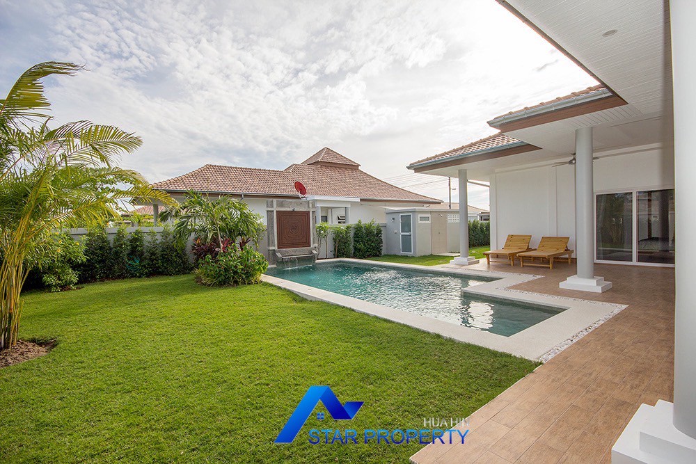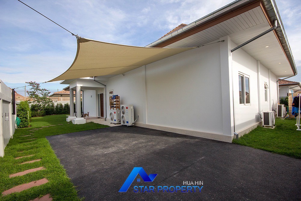 A beautiful and luxurious home, situated in an exclusive estate only 10 kilometers from Hua Hin city centre. This house has a true Asian feel whilst incorporating all modern conveniences. The lush, tropical garden stocked with mature plants surrounds the sun deck and private swimming pool. The inside of the house has been designed to meet high construction specifications. It has been finished to modern and European standards. Using high quality materials and local craftsmen, you can be assured that these homes are built to the highest standards. Main drains, water, waste and electricity are all located underground.