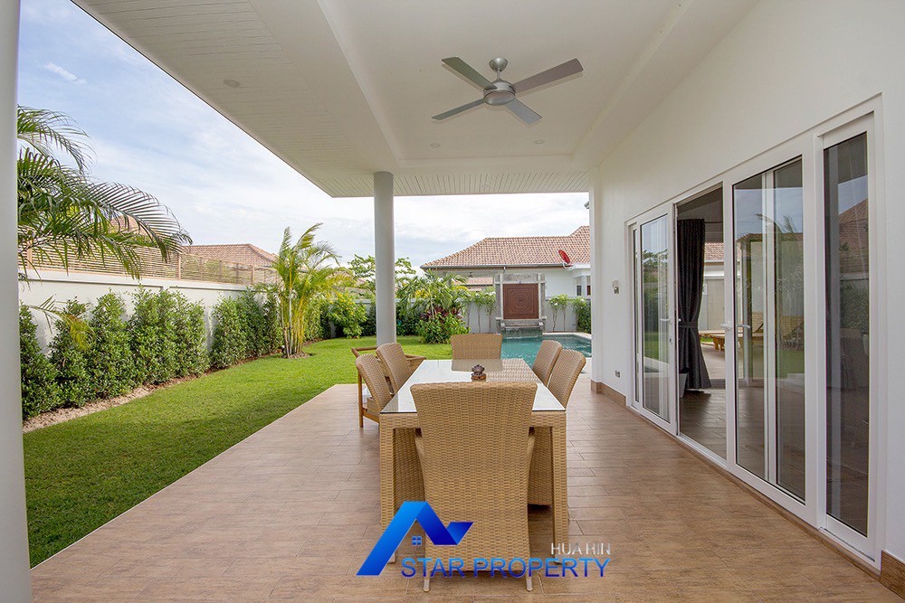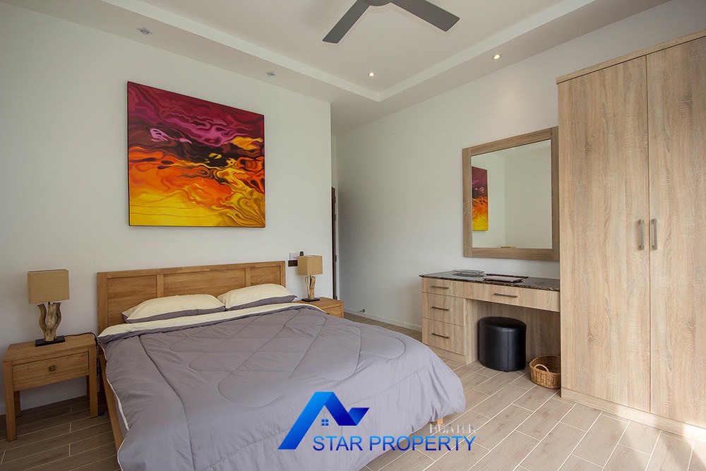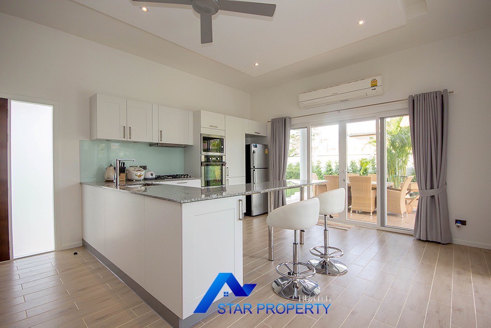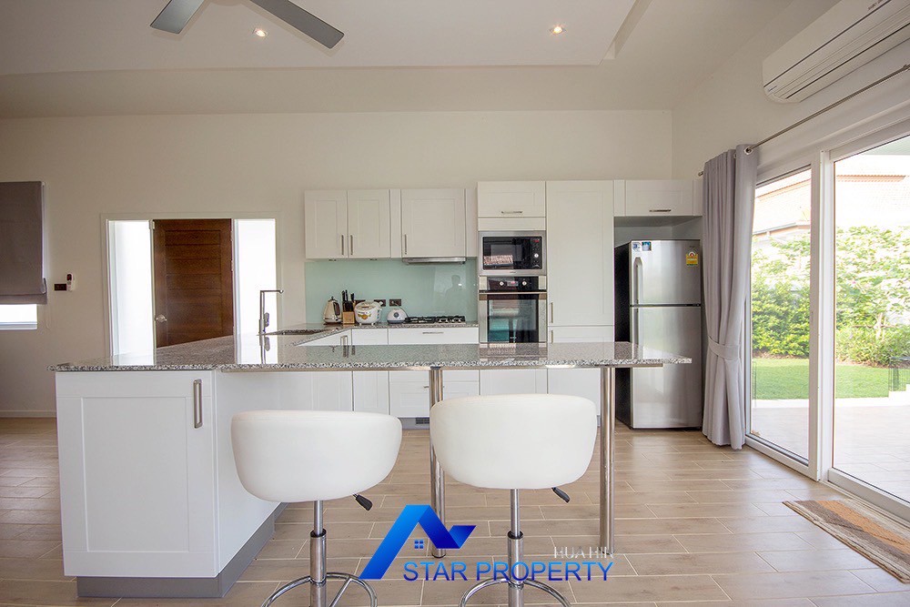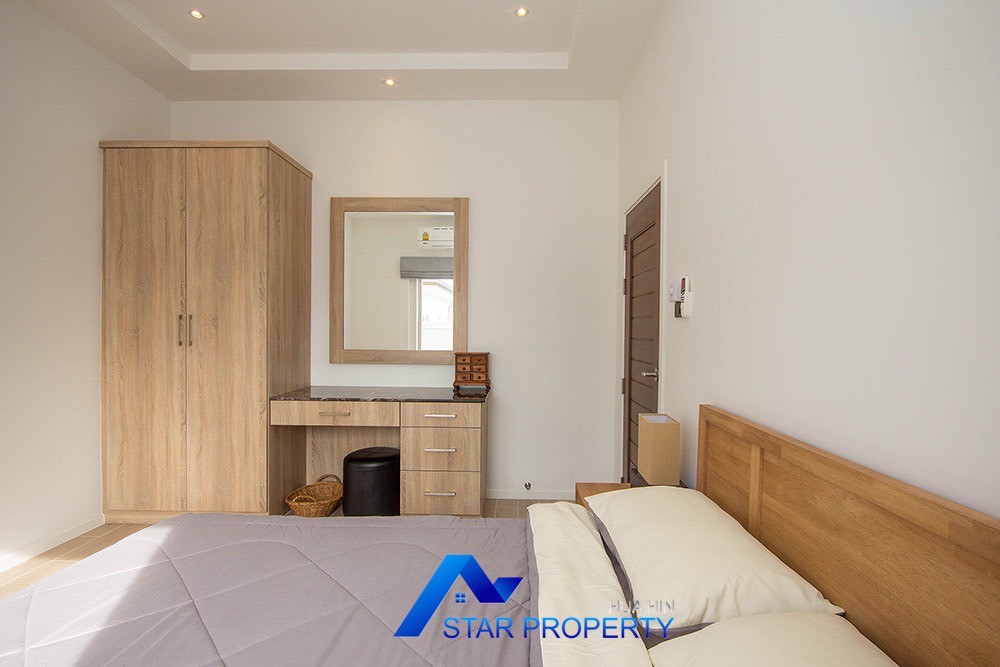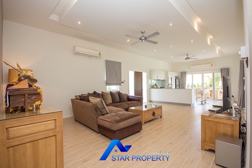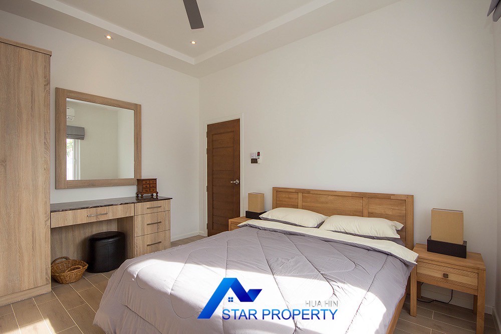 A beautiful and luxurious home, situated in an exclusive estate only 10 kilometers from Hua Hin city centre. This house has a true Asian feel whilst incorporating all modern conveniences. The lush, tropical garden stocked with mature plants surrounds the sun deck and private swimming pool. The inside of the house has been designed to meet high construction specifications. It has been finished to modern and European standards. Using high quality materials and local craftsmen, you can be assured that these homes are built to the highest standards. Main drains, water, waste and electricity are all located underground.