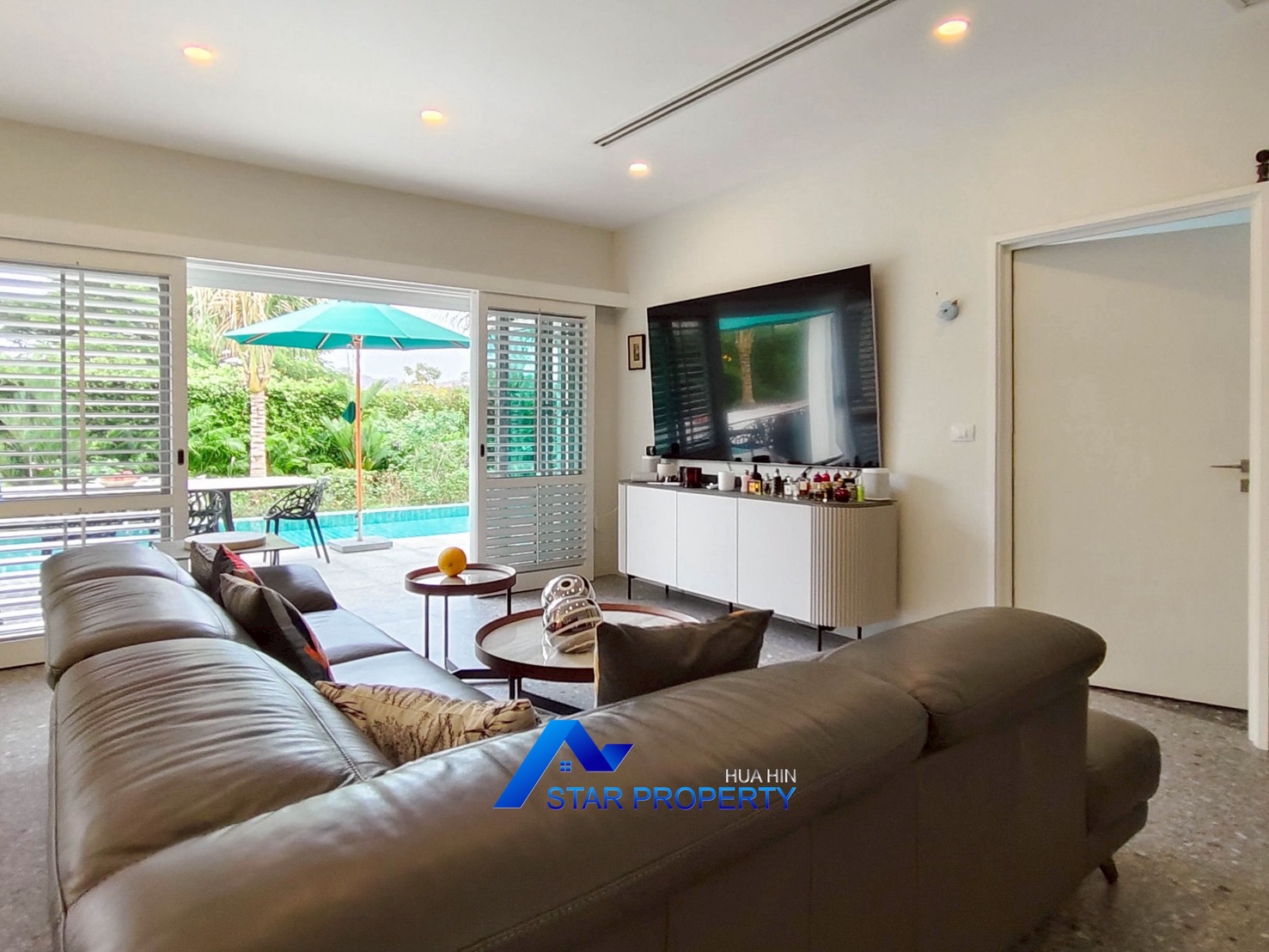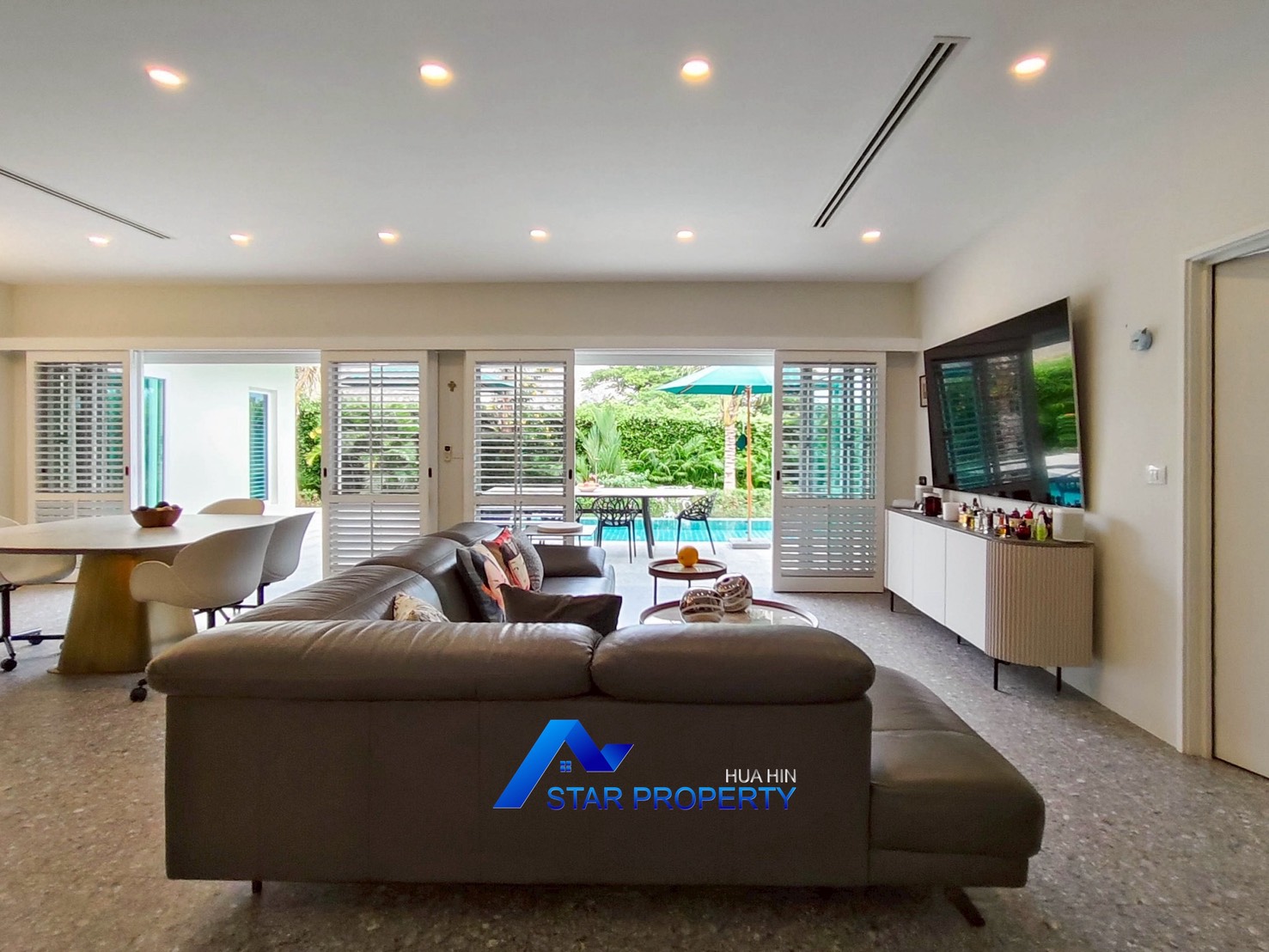 Seamless Indoor-Outdoor Flow: The open-plan living and dining areas feature large concertina doors that open fully to the terrace, blending the interior with the private pool area.