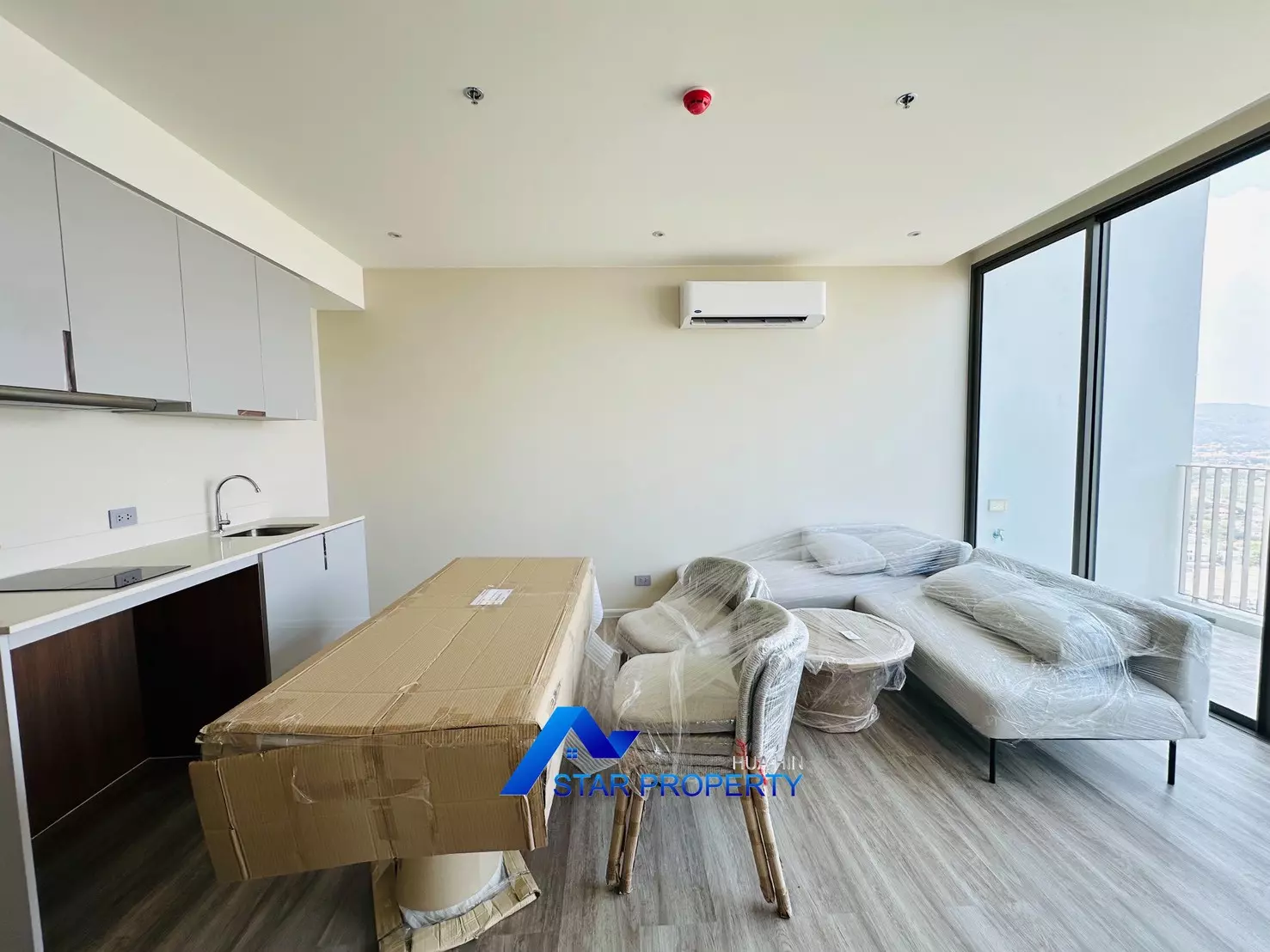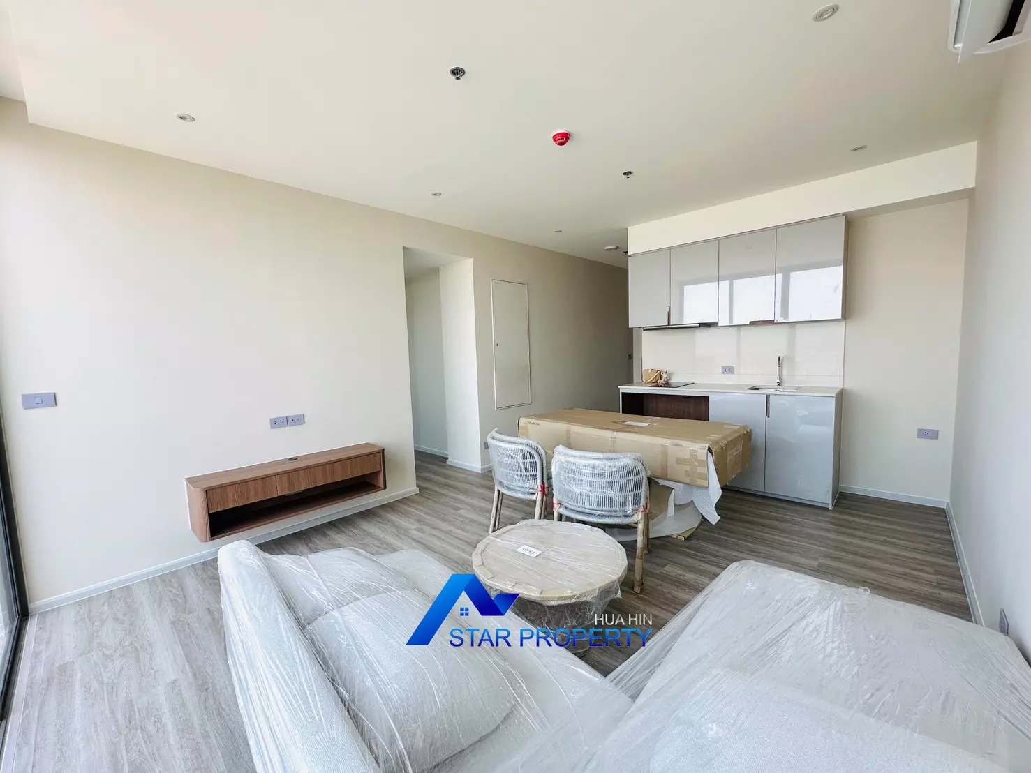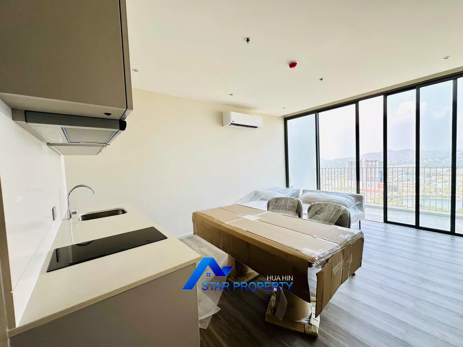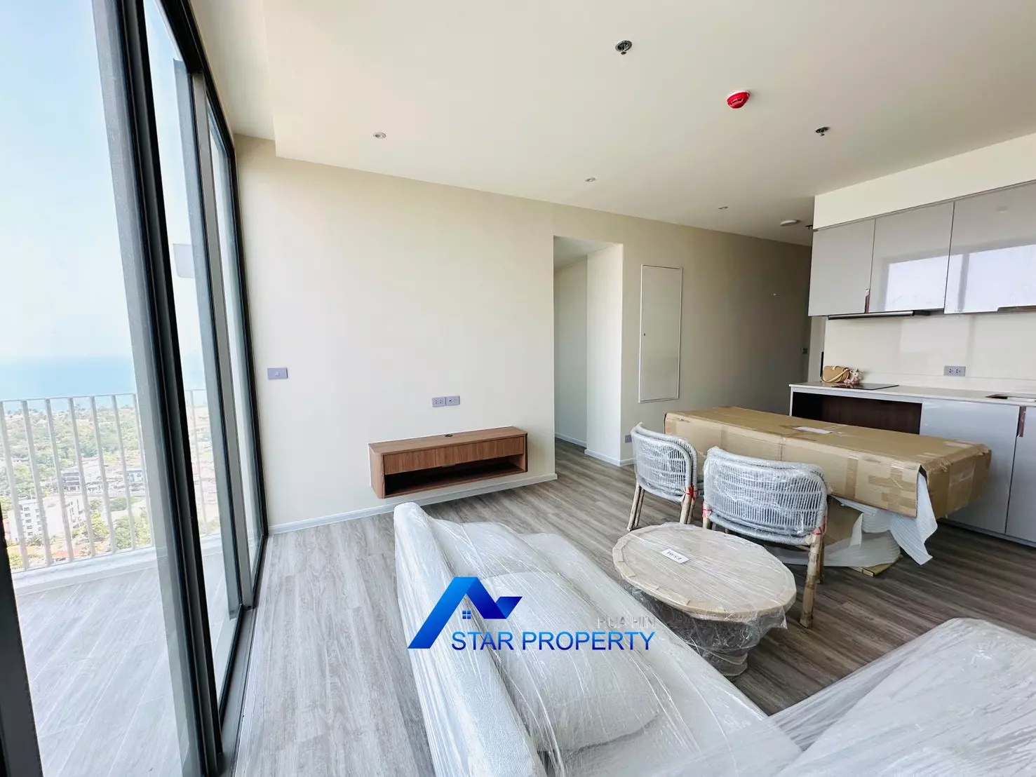 The apartment is fully furnished with brand-new, high-quality furniture, ready for immediate move-in. The modern open-plan living and dining area connects seamlessly to a very large balcony, perfect for relaxing, entertaining, or enjoying stunning sunsets over Hua Hin.