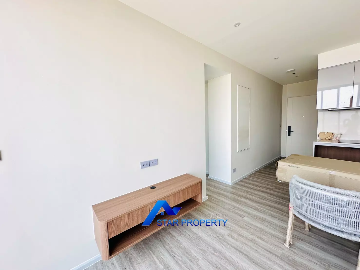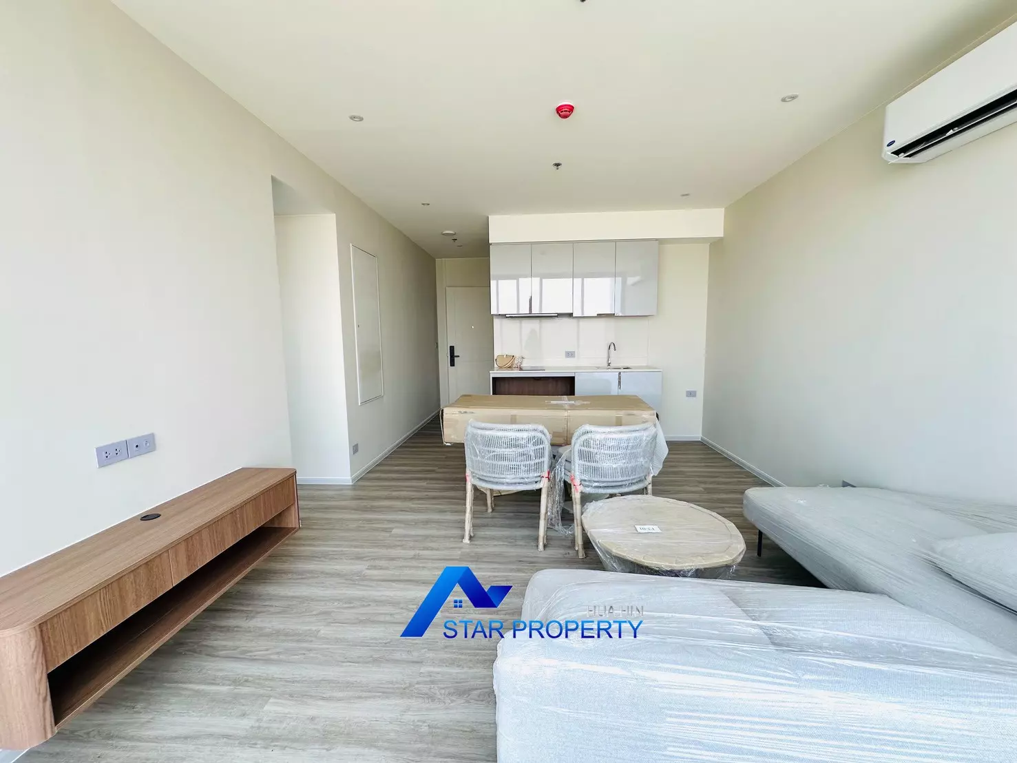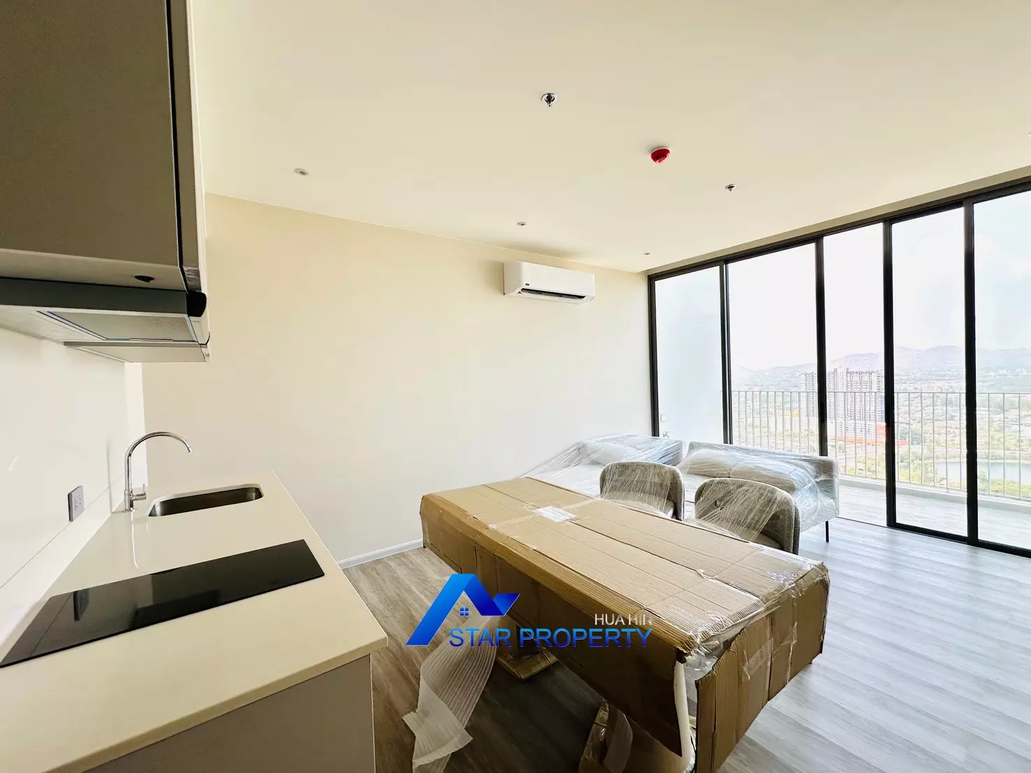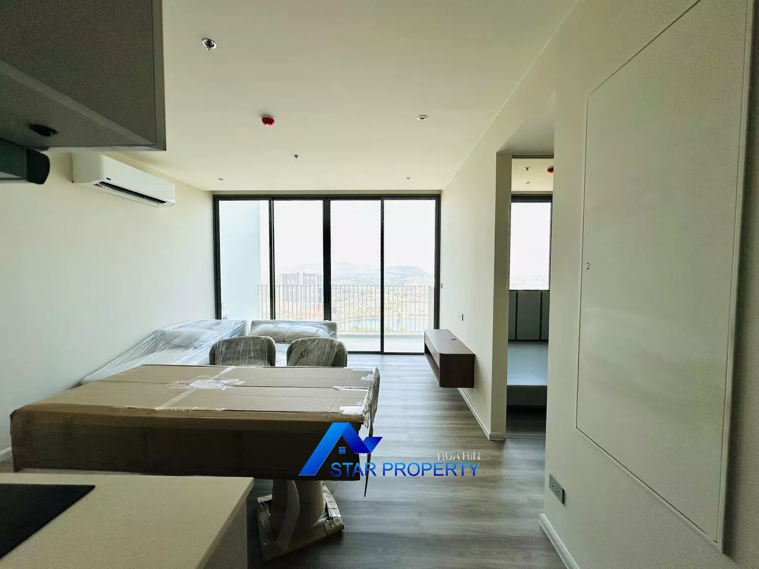 The apartment is fully furnished with brand-new, high-quality furniture, ready for immediate move-in. The modern open-plan living and dining area connects seamlessly to a very large balcony, perfect for relaxing, entertaining, or enjoying stunning sunsets over Hua Hin.