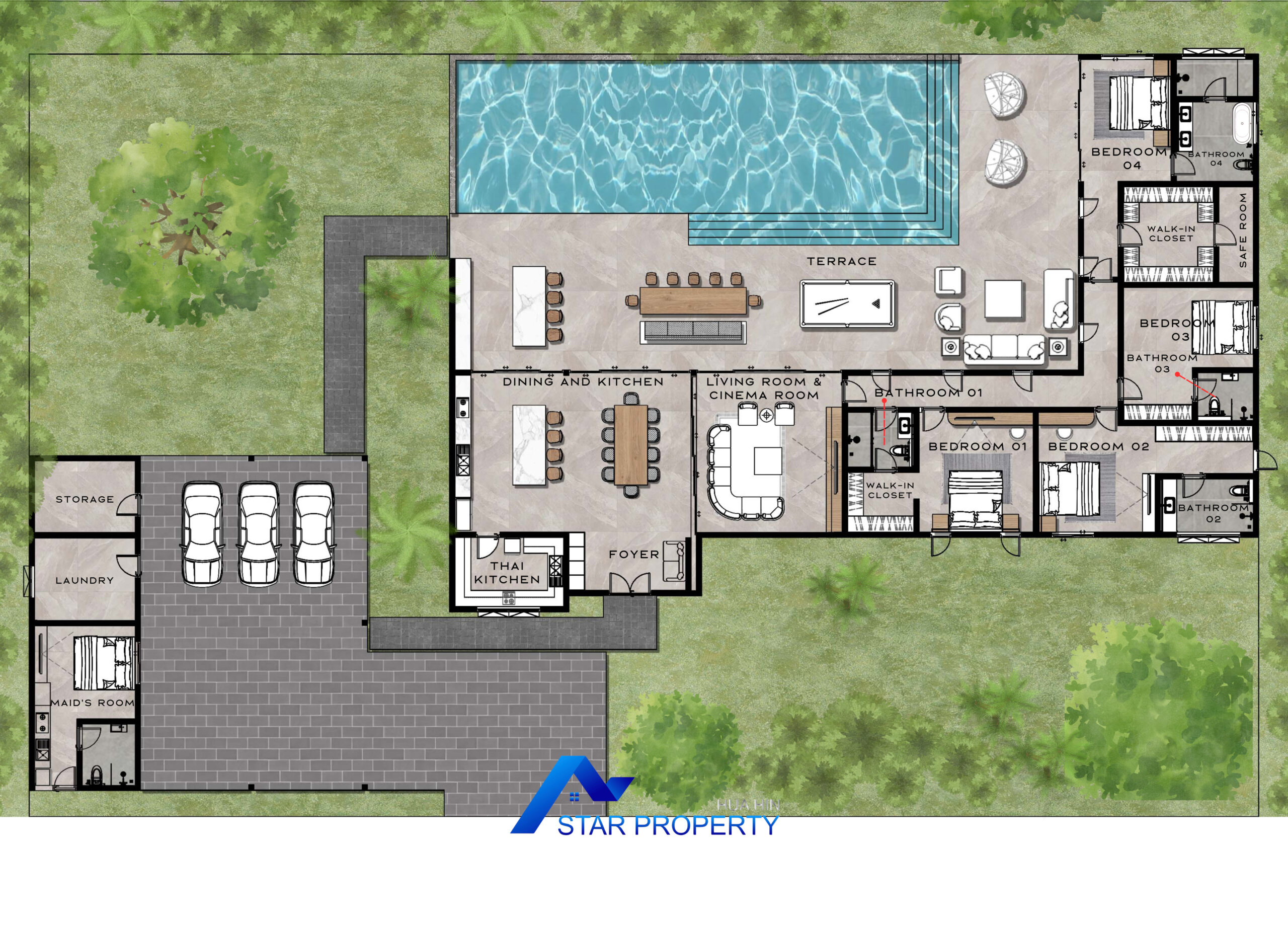 A grand, thoughtfully designed villa created for luxury family living and effortless entertaining. This spacious home features multiple living areas, a private cinema room, and dual kitchens—ideal for hosting guests while maintaining privacy and comfort.