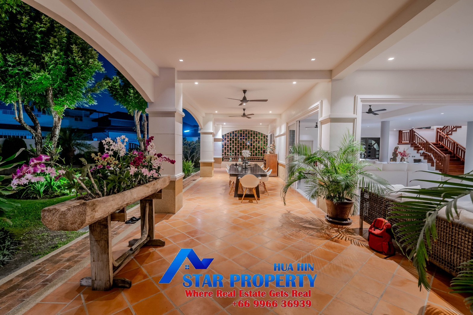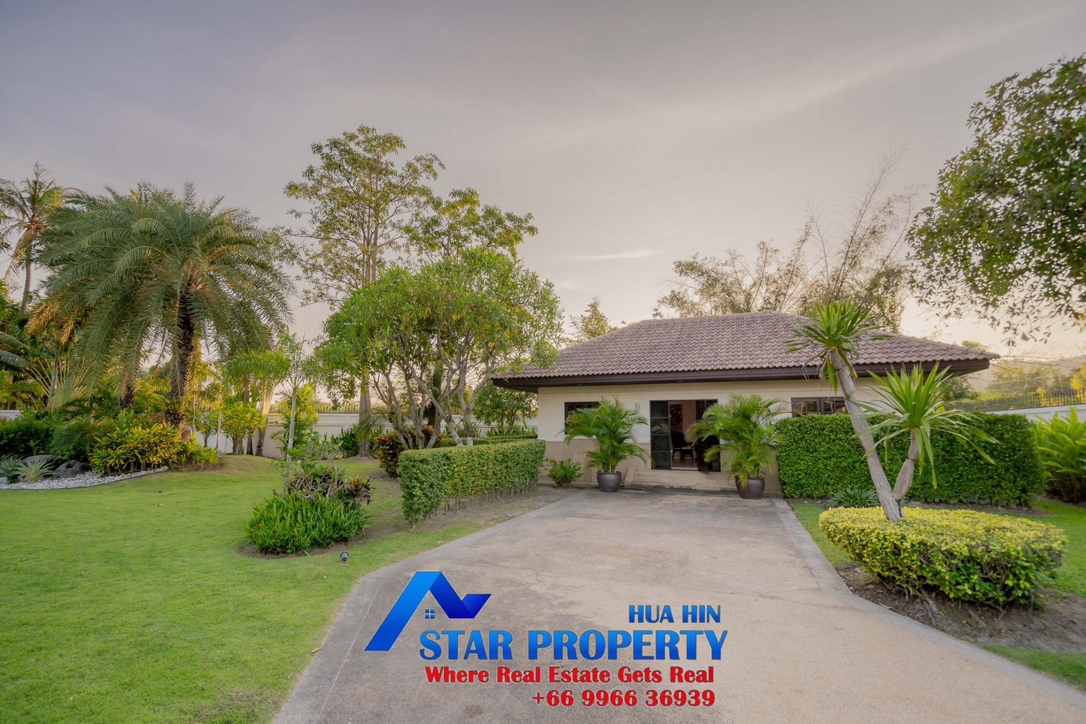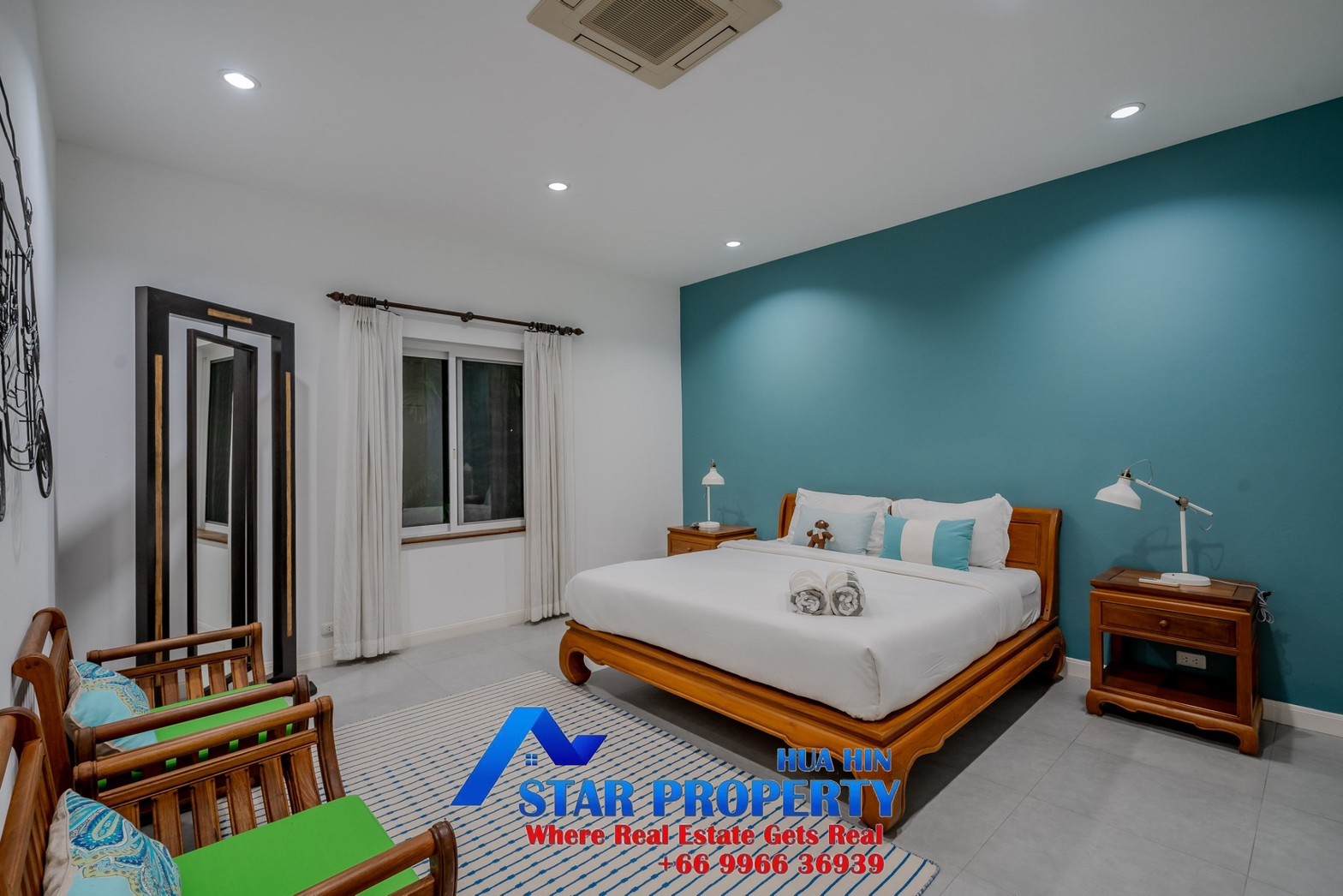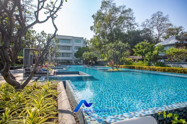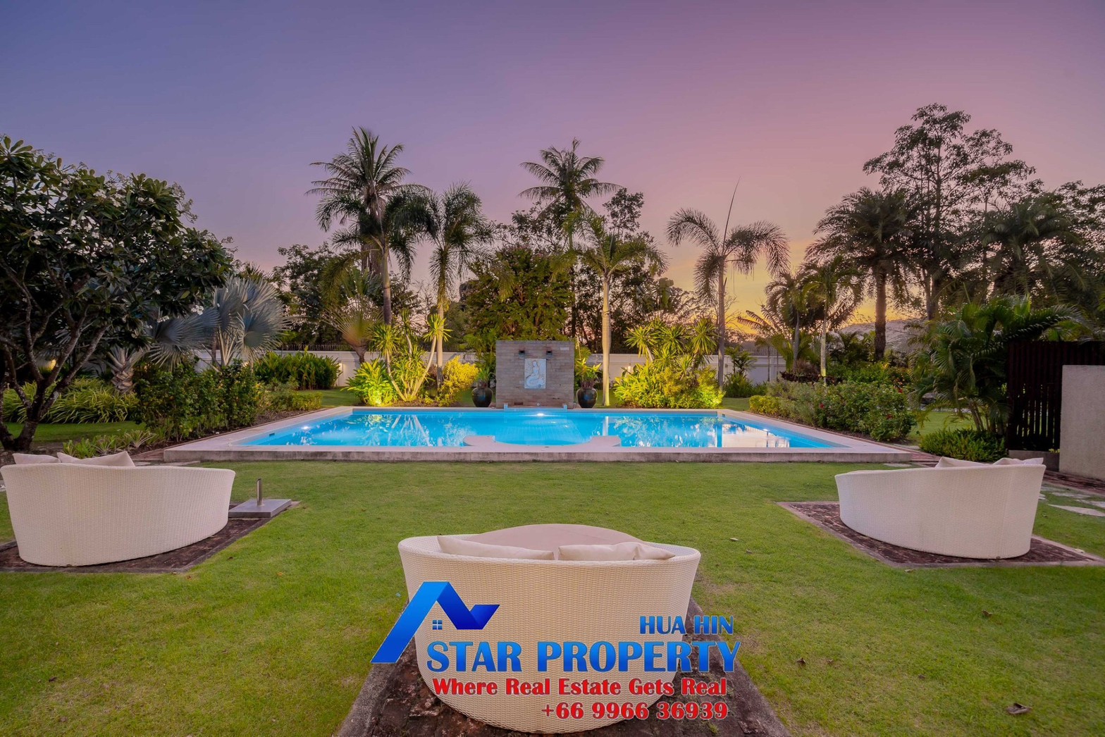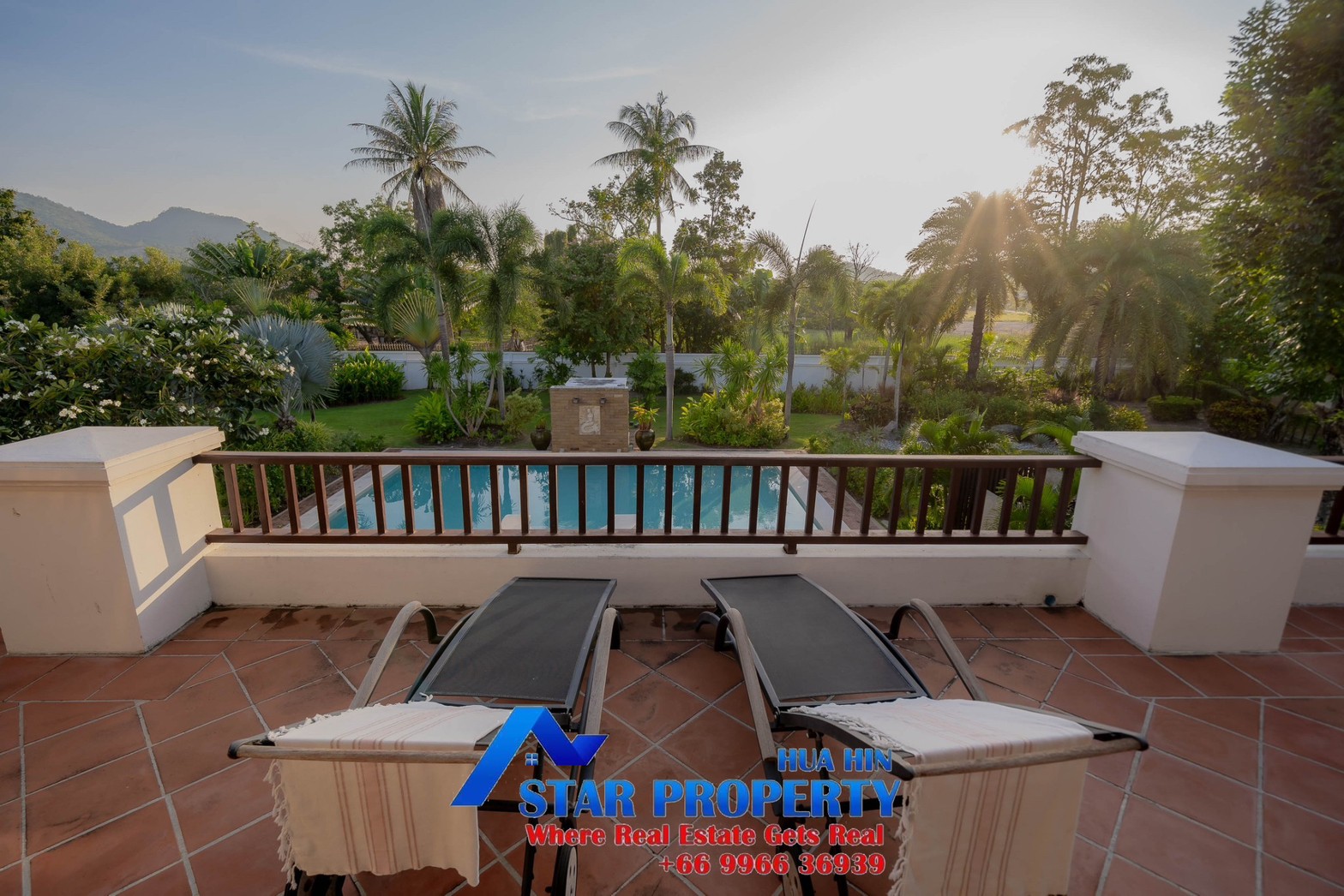 Lovely large pool villa with spacious living areas both indoors and on a large balcony. This 2-storey villa sits on a large 4200 sq m plot of land close to Hua Hin city center and the beach. Tropical gardens are landscaped by garden designers. It also includes a golf course training area with sand bunkers, chopping equipment and your own putting green. There is a large swimming pool area with a jacuzzi and waterfall, as well as an adjacent relaxation area.