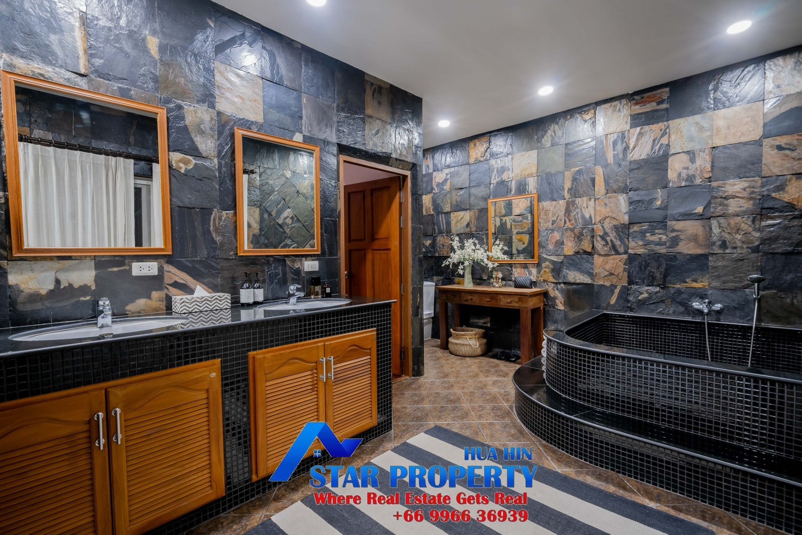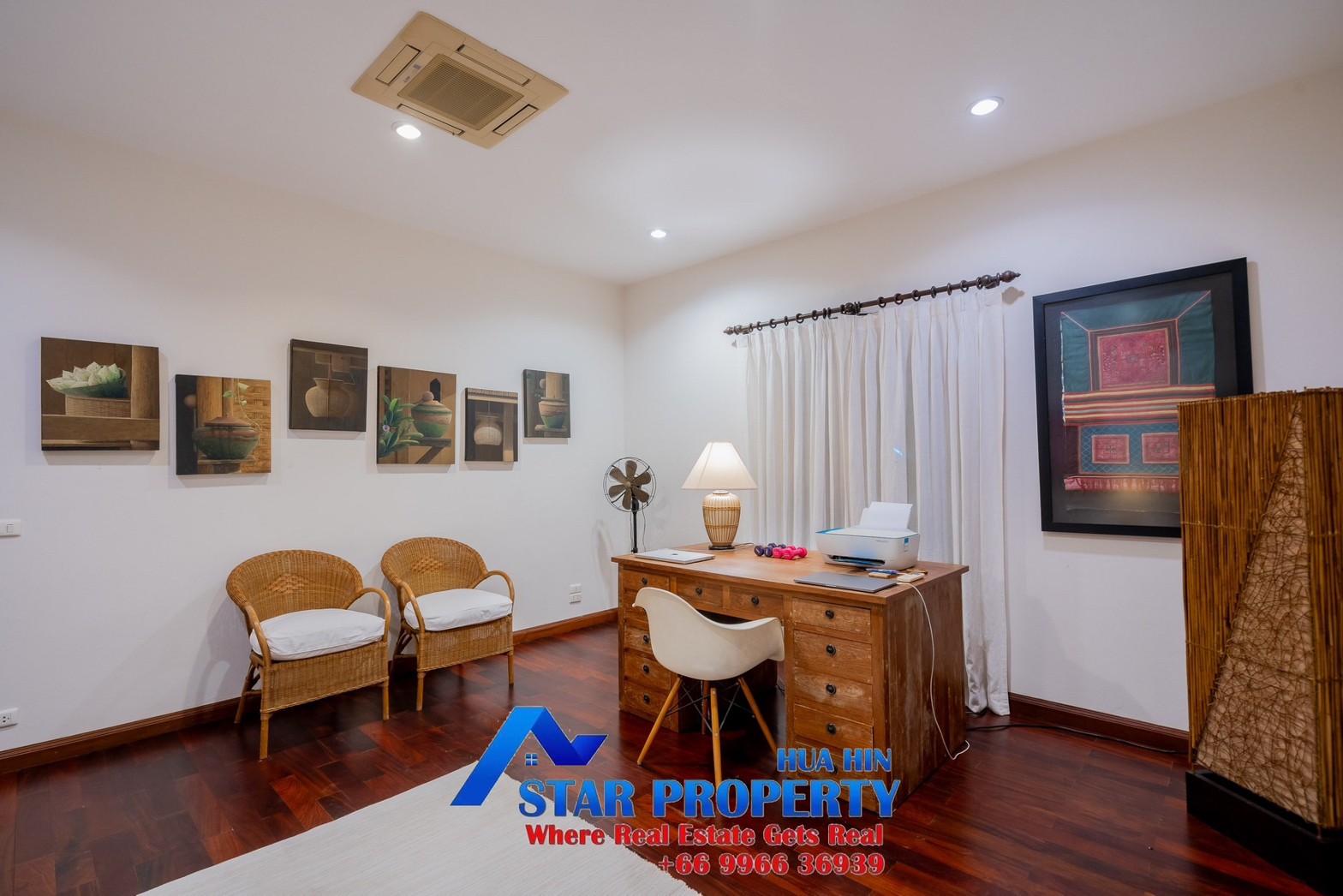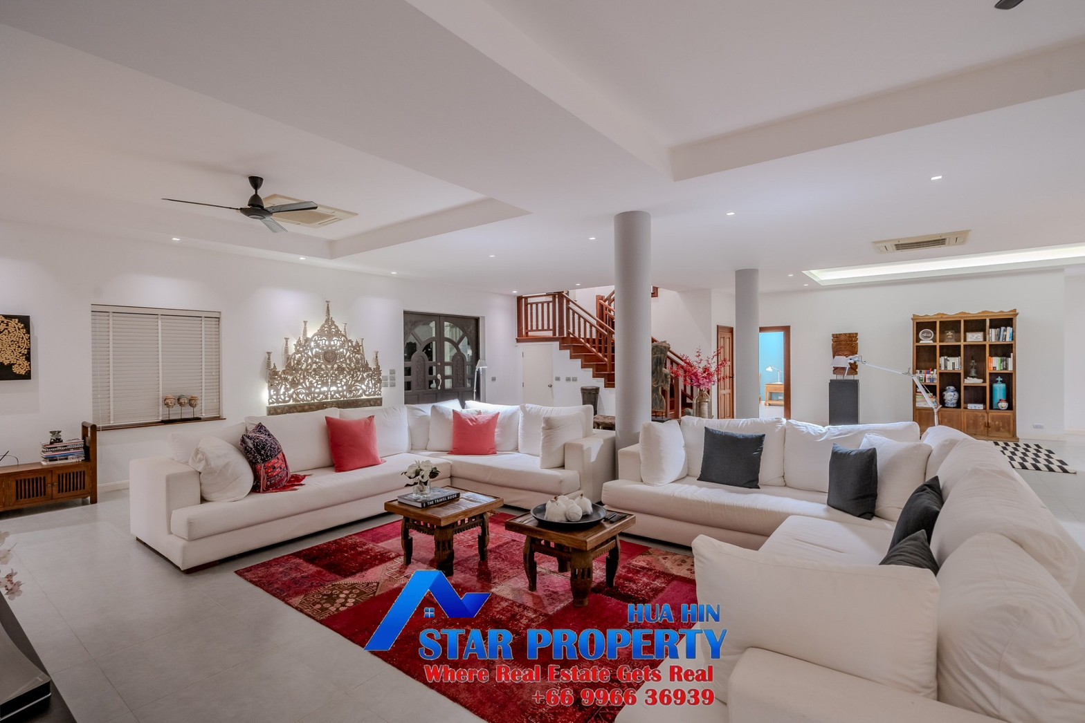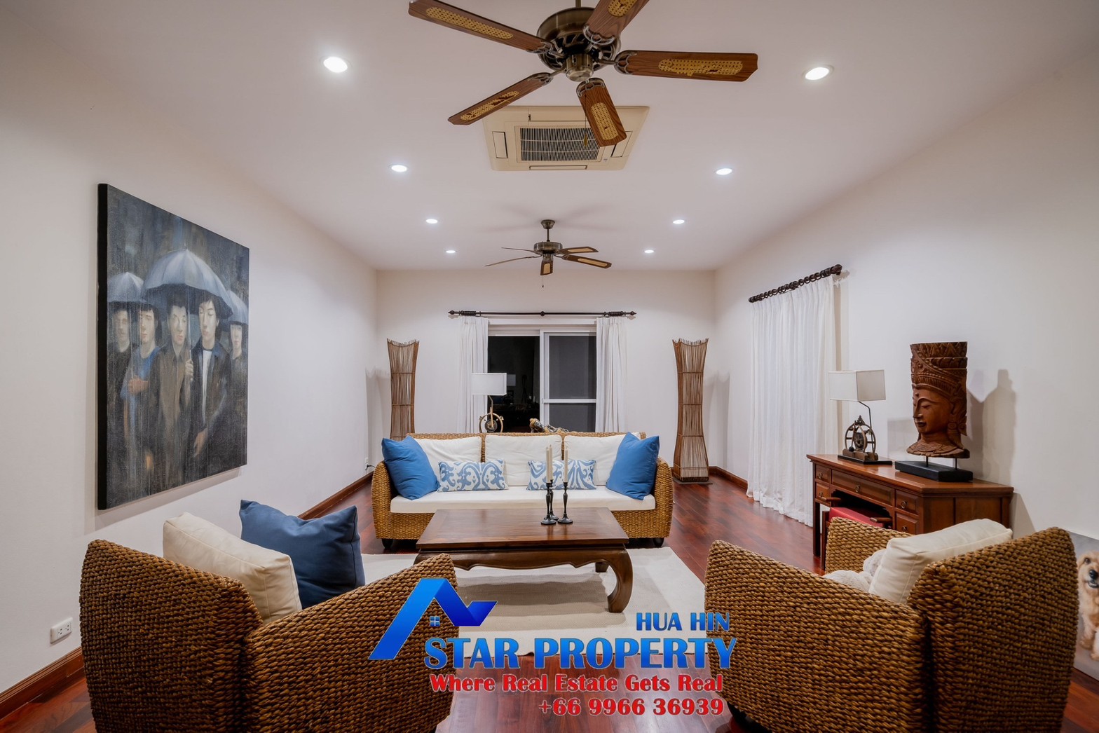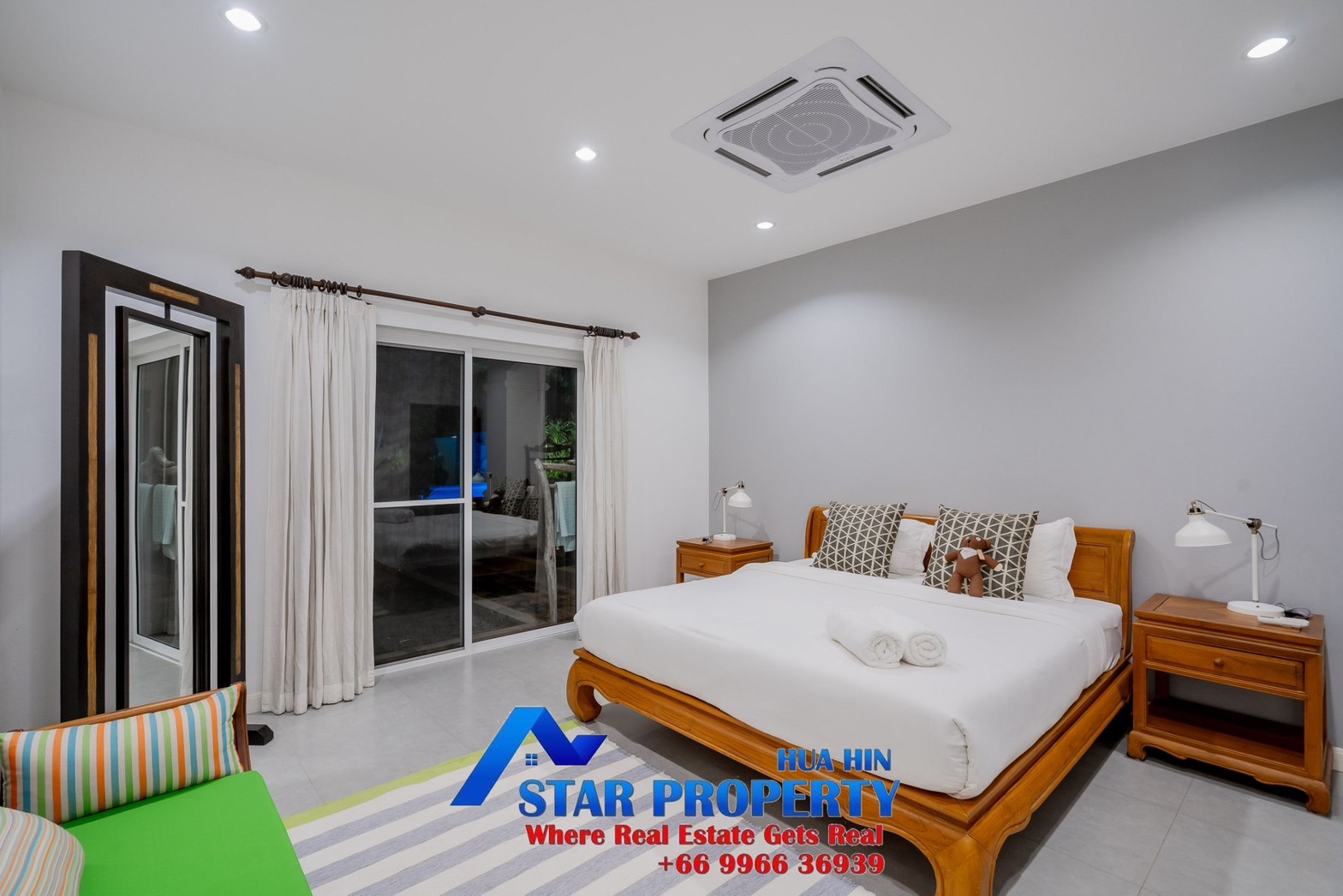 Lovely large pool villa with spacious living areas both indoors and on a large balcony. This 2-storey villa sits on a large 4200 sq m plot of land close to Hua Hin city center and the beach. Tropical gardens are landscaped by garden designers. It also includes a golf course training area with sand bunkers, chopping equipment and your own putting green. There is a large swimming pool area with a jacuzzi and waterfall, as well as an adjacent relaxation area.