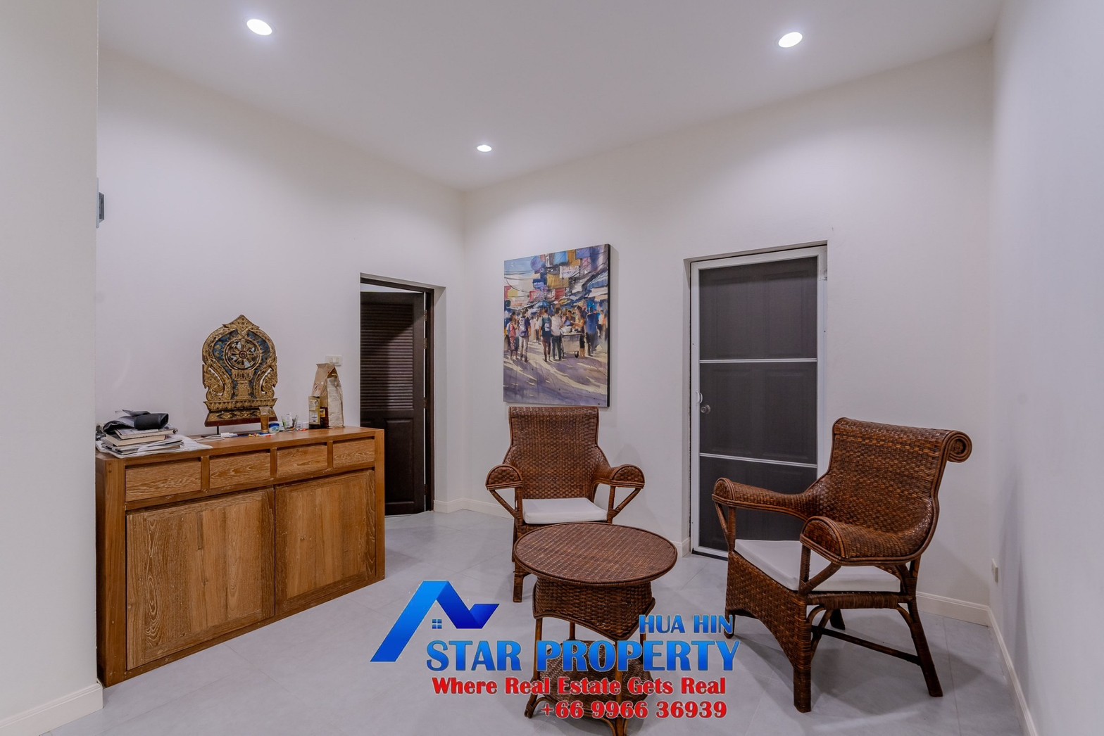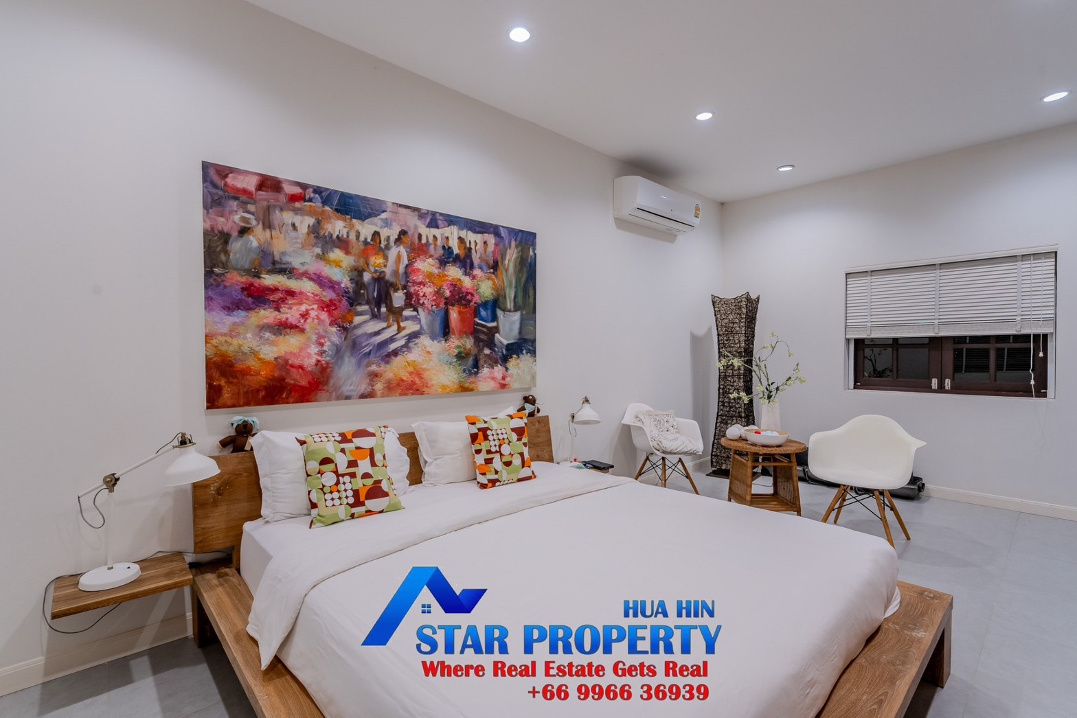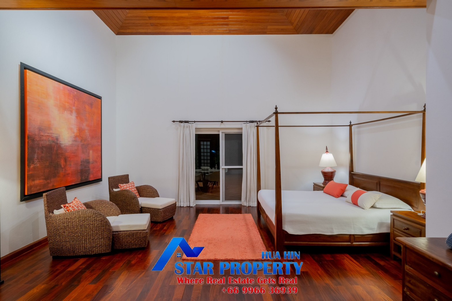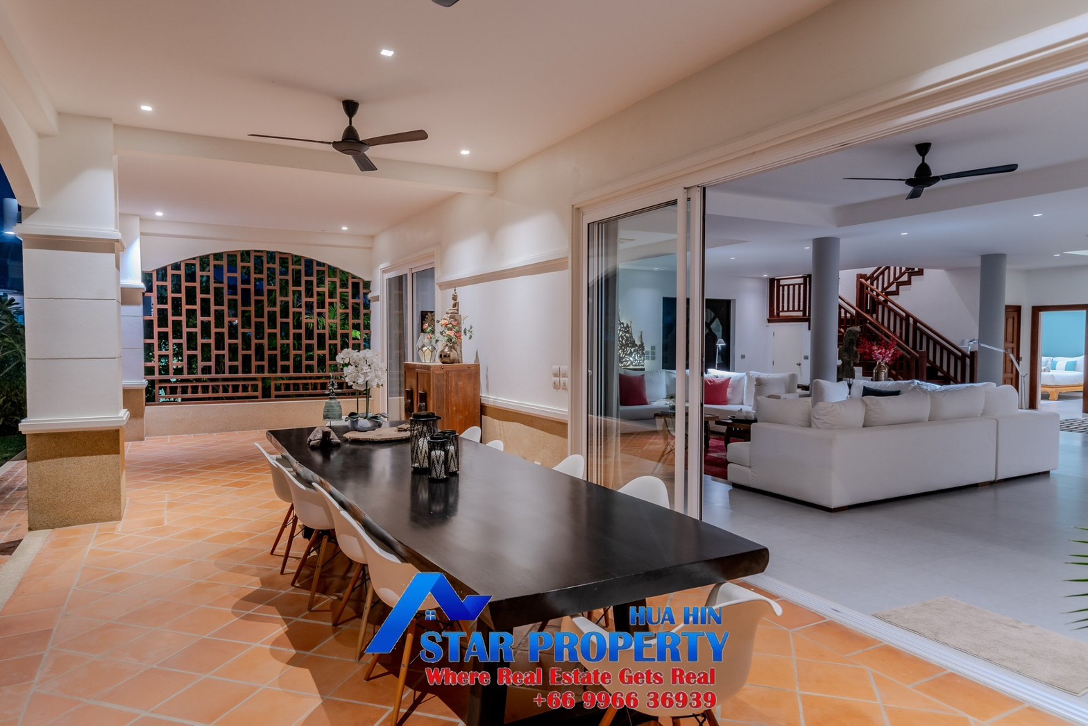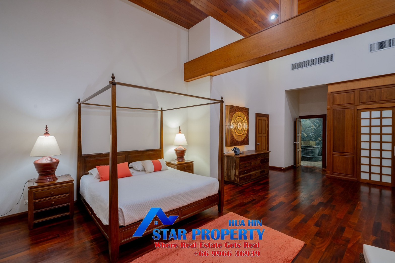 Lovely large pool villa with spacious living areas both indoors and on a large balcony. This 2-storey villa sits on a large 4200 sq m plot of land close to Hua Hin city center and the beach. Tropical gardens are landscaped by garden designers. It also includes a golf course training area with sand bunkers, chopping equipment and your own putting green. There is a large swimming pool area with a jacuzzi and waterfall, as well as an adjacent relaxation area.