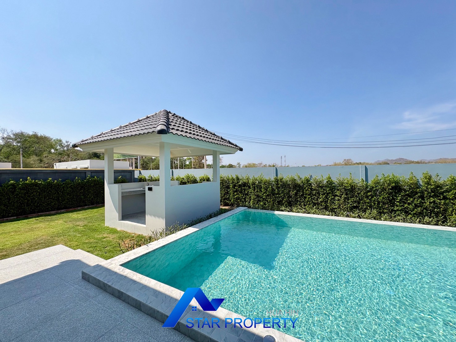 The outdoor area is designed for relaxation and entertaining, highlighted by a private swimming pool measuring 4 × 10 meters and surrounding space to enjoy Hua Hin’s tropical climate. The property also includes covered parking for two cars.