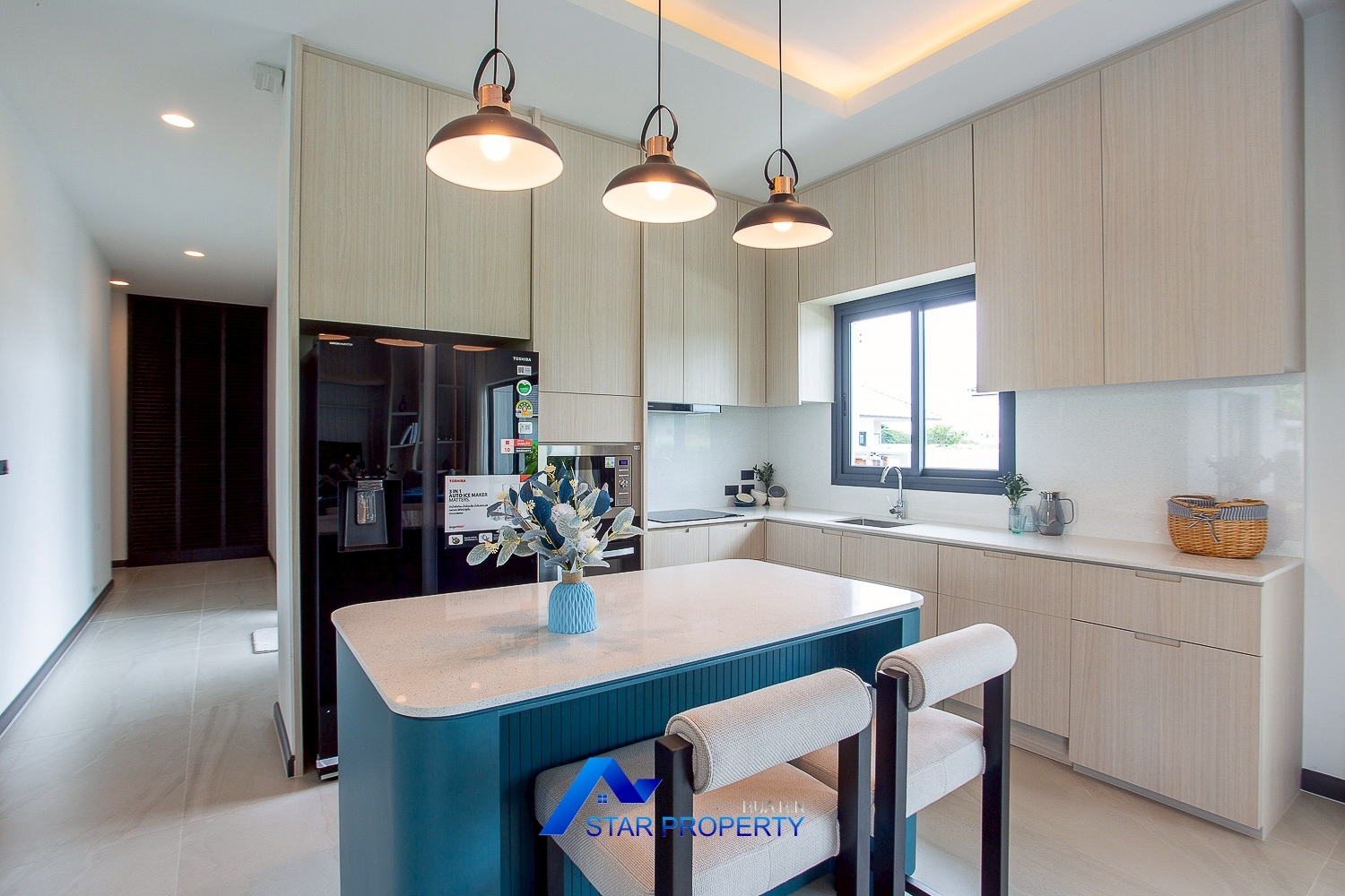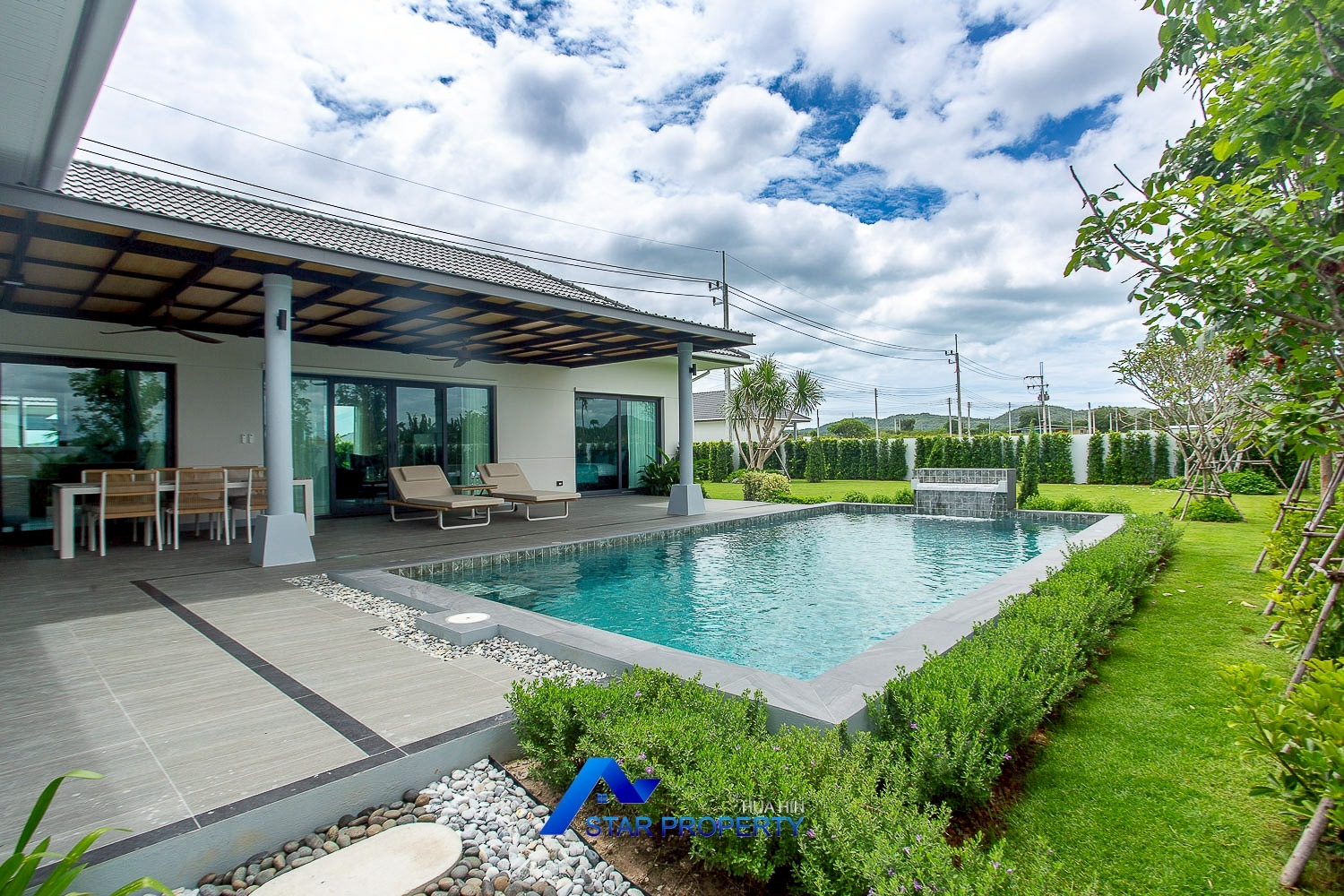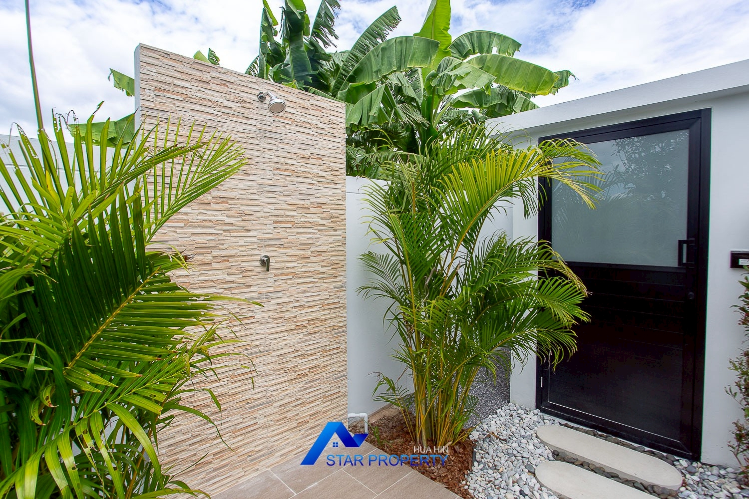 Nantra Residence is located in a quiet area of Thap Tai, Hua Hin, offering a luxurious single-storey villa experience amidst lush landscaped surroundings. The villa features contemporary architecture designed to blend in with nature, with beautifully manicured lawns and relaxing green spaces.