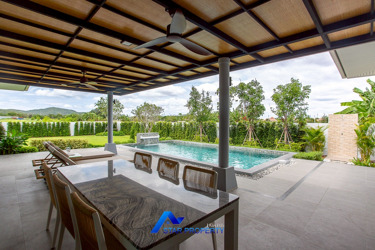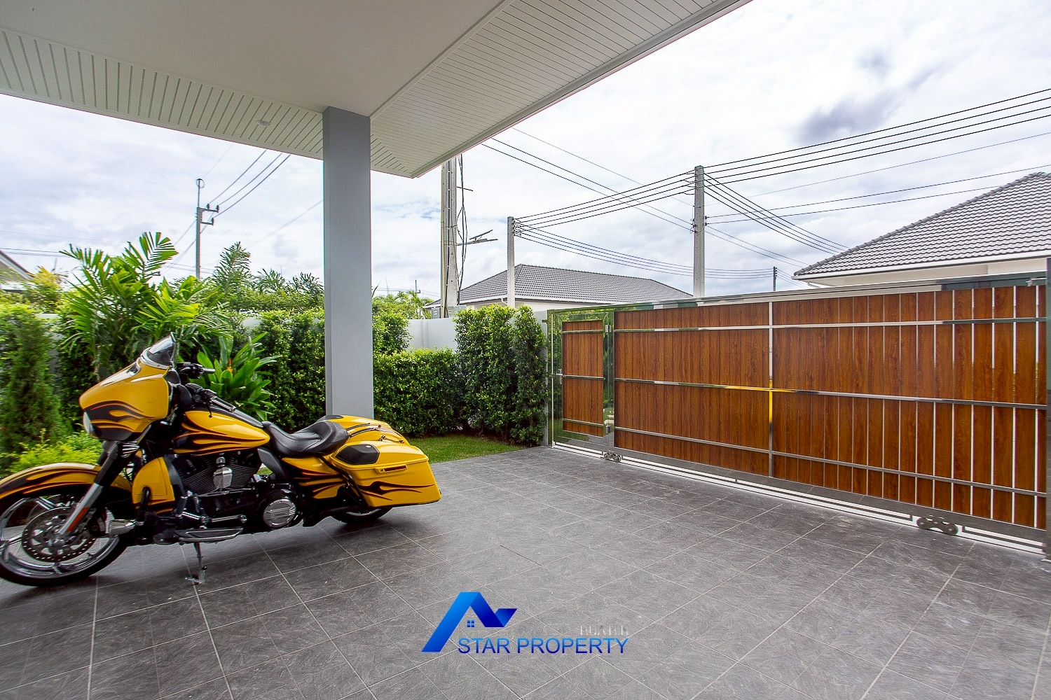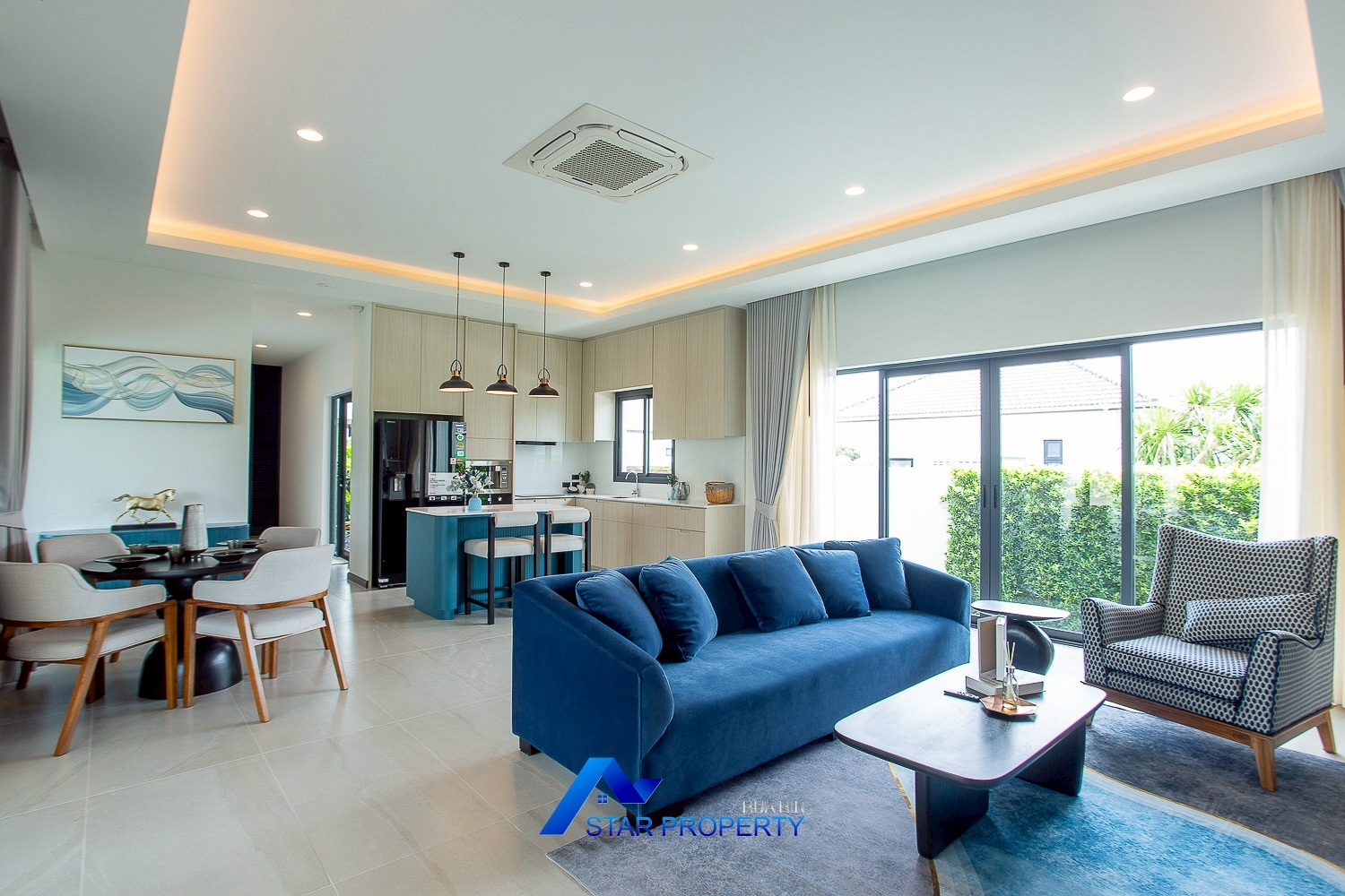 Nantra Residence is located in a quiet area of Thap Tai, Hua Hin, offering a luxurious single-storey villa experience amidst lush landscaped surroundings. The villa features contemporary architecture designed to blend in with nature, with beautifully manicured lawns and relaxing green spaces.