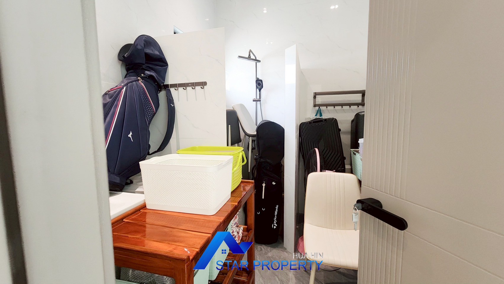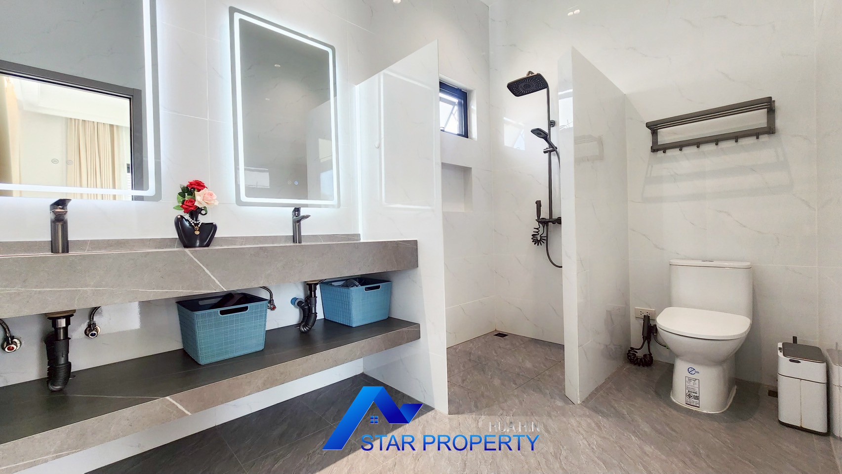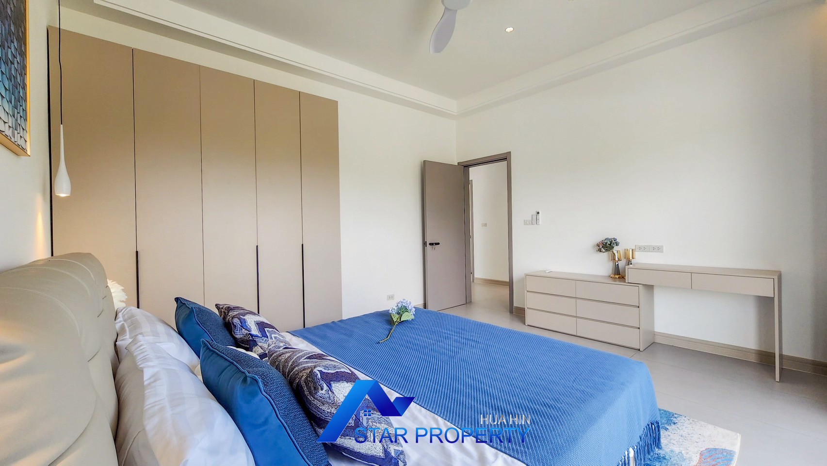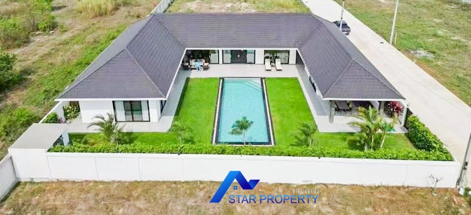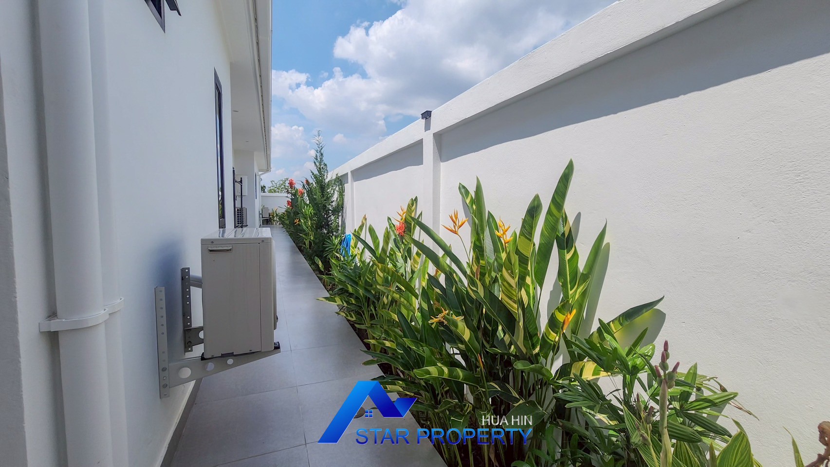 This new beautiful pool villa with 5 bedrooms 5 bathrooms complete with private garden and pool size 4.5*11 meter with salt system. The location at Hua Hin soi 70, 3 km from Black mountain golf course and 11 km from Huahin town. The villa offers top quality materials. Fully furnished and ready for immediate occupancy. Land area 808 sq.m (Title deed red color). Living area 300 sq.m. ,Laundry room and Storage room. Parking space for 2 vehicles, 4,000-liter water tank with water supplied from Pranburi. No common fees.