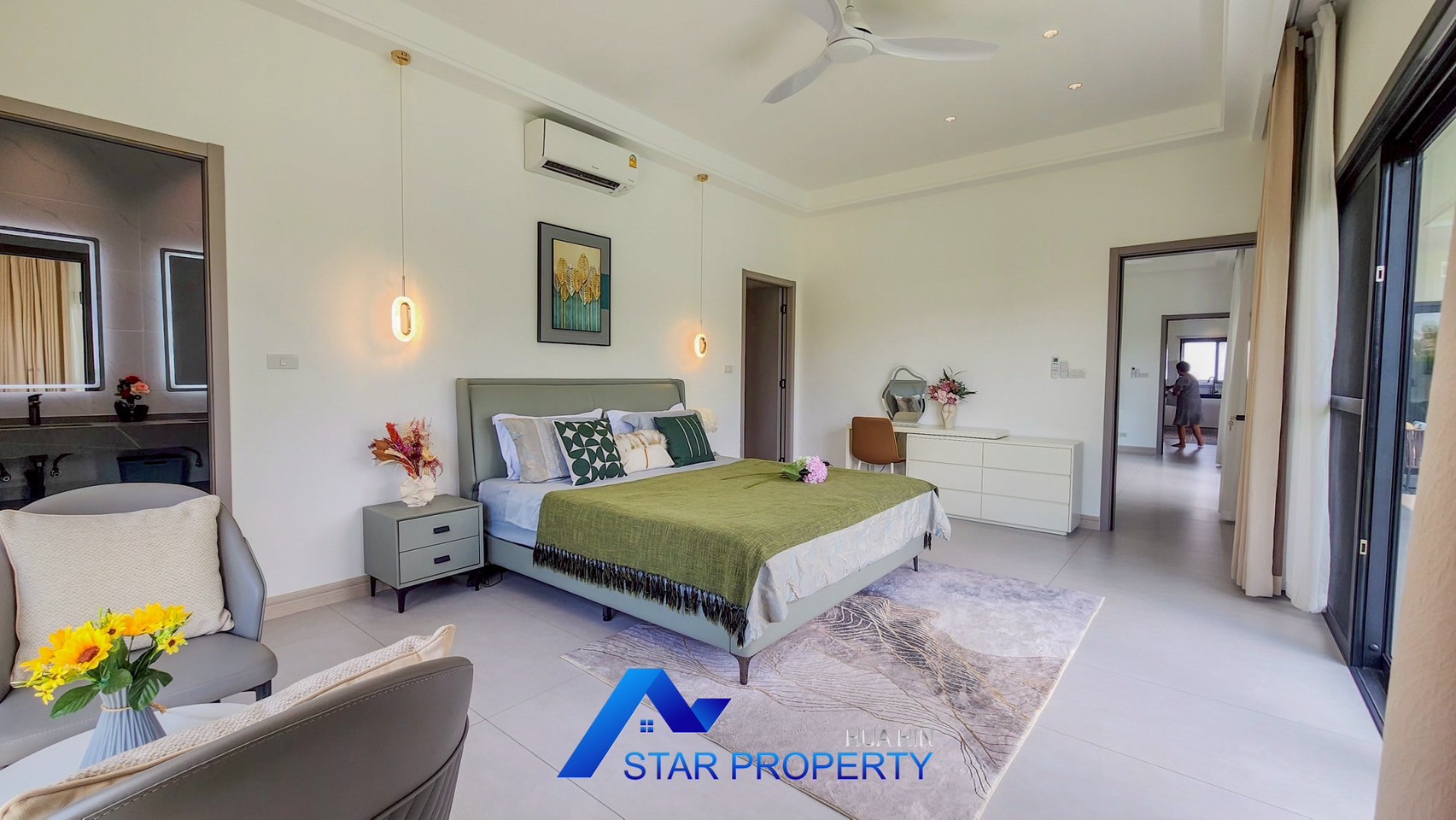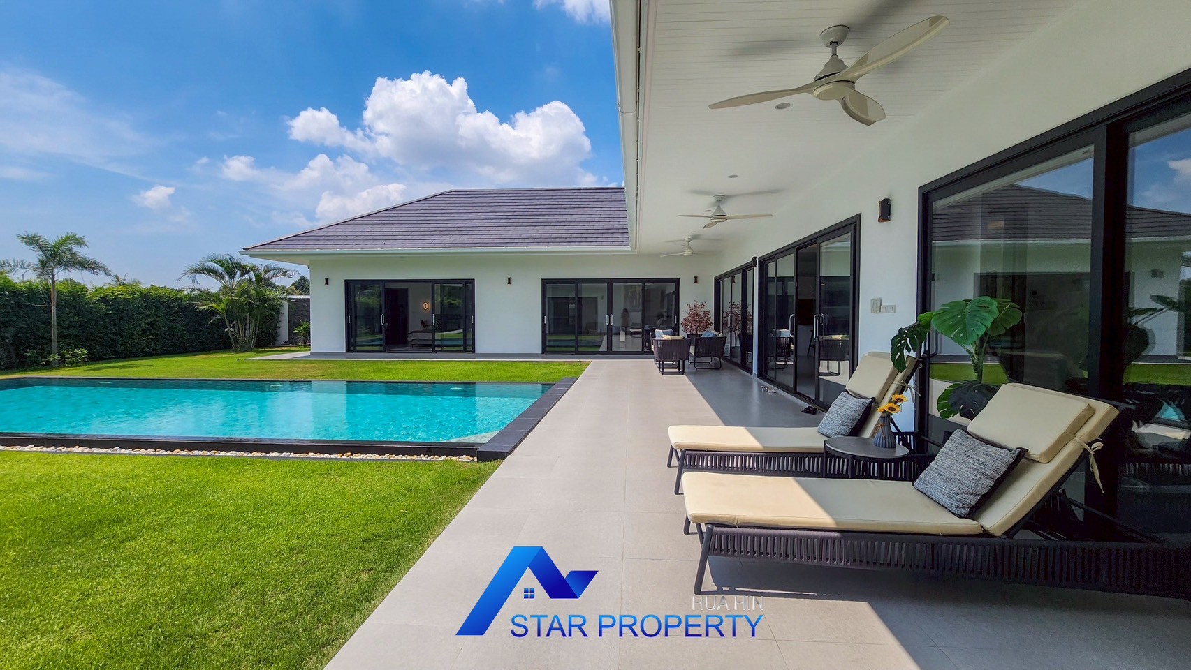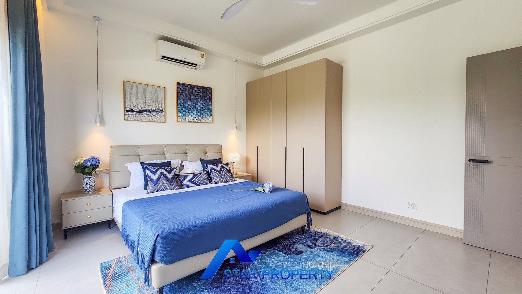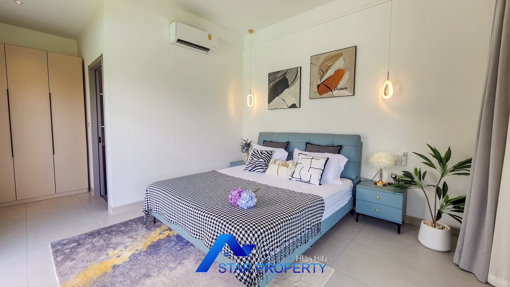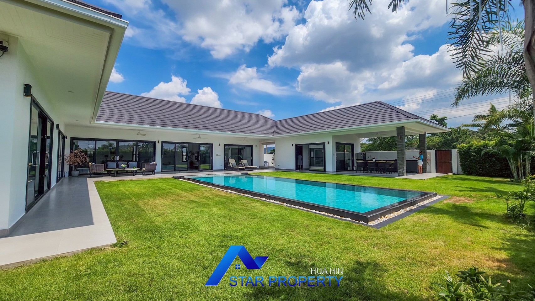 This new beautiful pool villa with 5 bedrooms 5 bathrooms complete with private garden and pool size 4.5*11 meter with salt system. The location at Hua Hin soi 70, 3 km from Black mountain golf course and 11 km from Huahin town. The villa offers top quality materials. Fully furnished and ready for immediate occupancy. Land area 808 sq.m (Title deed red color). Living area 300 sq.m. ,Laundry room and Storage room. Parking space for 2 vehicles, 4,000-liter water tank with water supplied from Pranburi. No common fees.