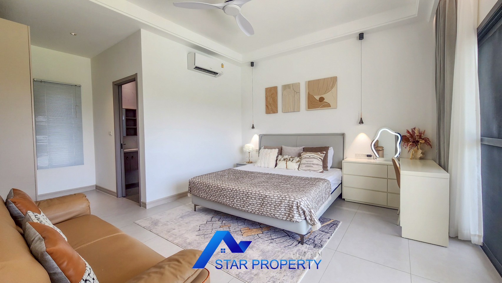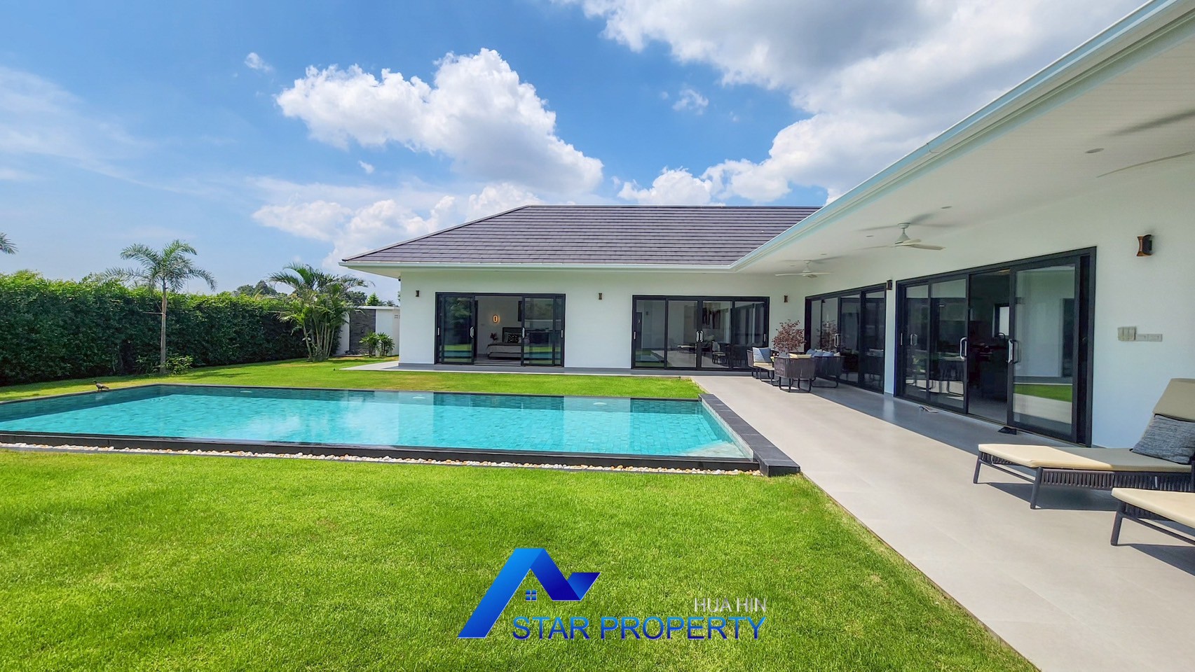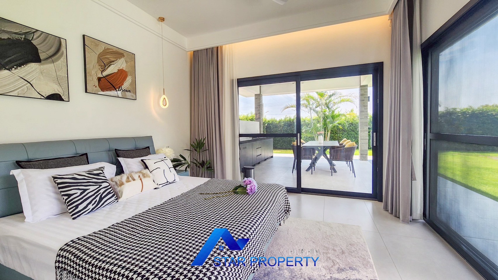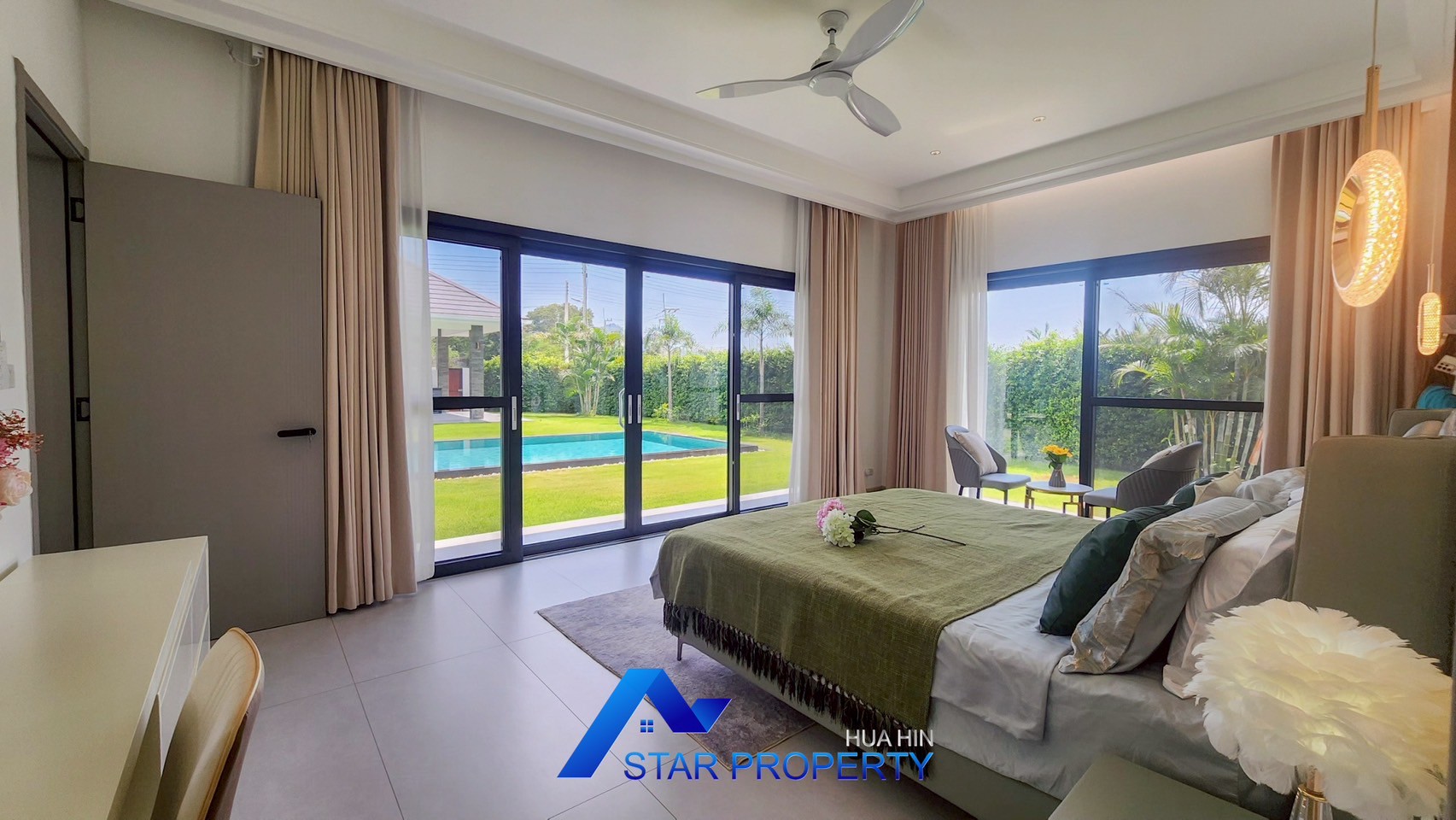 This new beautiful pool villa with 5 bedrooms 5 bathrooms complete with private garden and pool size 4.5*11 meter with salt system. The location at Hua Hin soi 70, 3 km from Black mountain golf course and 11 km from Huahin town. The villa offers top quality materials. Fully furnished and ready for immediate occupancy. Land area 808 sq.m (Title deed red color). Living area 300 sq.m. ,Laundry room and Storage room. Parking space for 2 vehicles, 4,000-liter water tank with water supplied from Pranburi. No common fees.