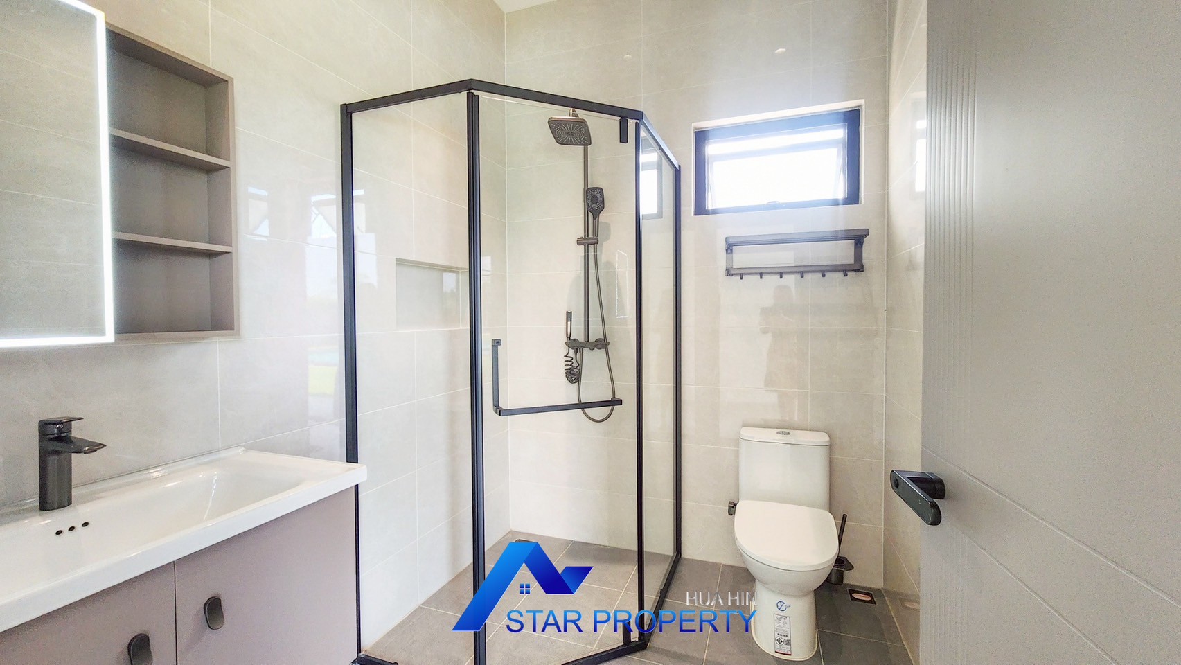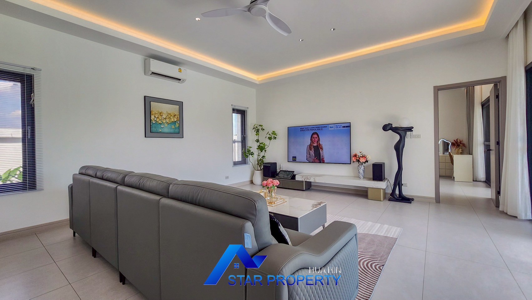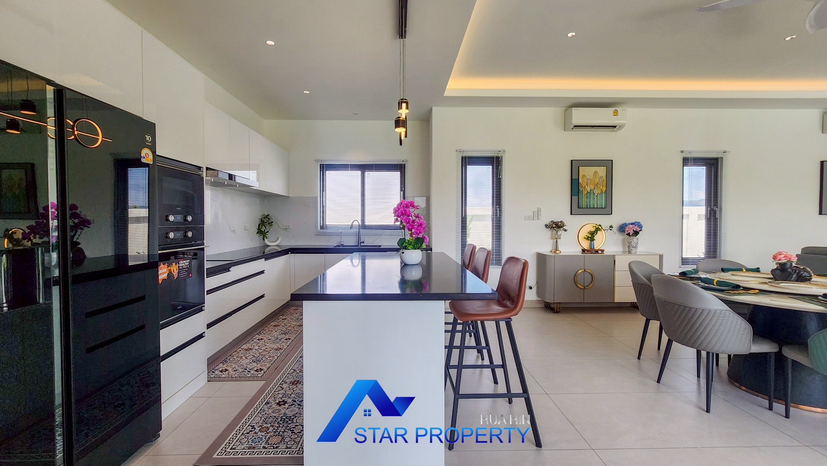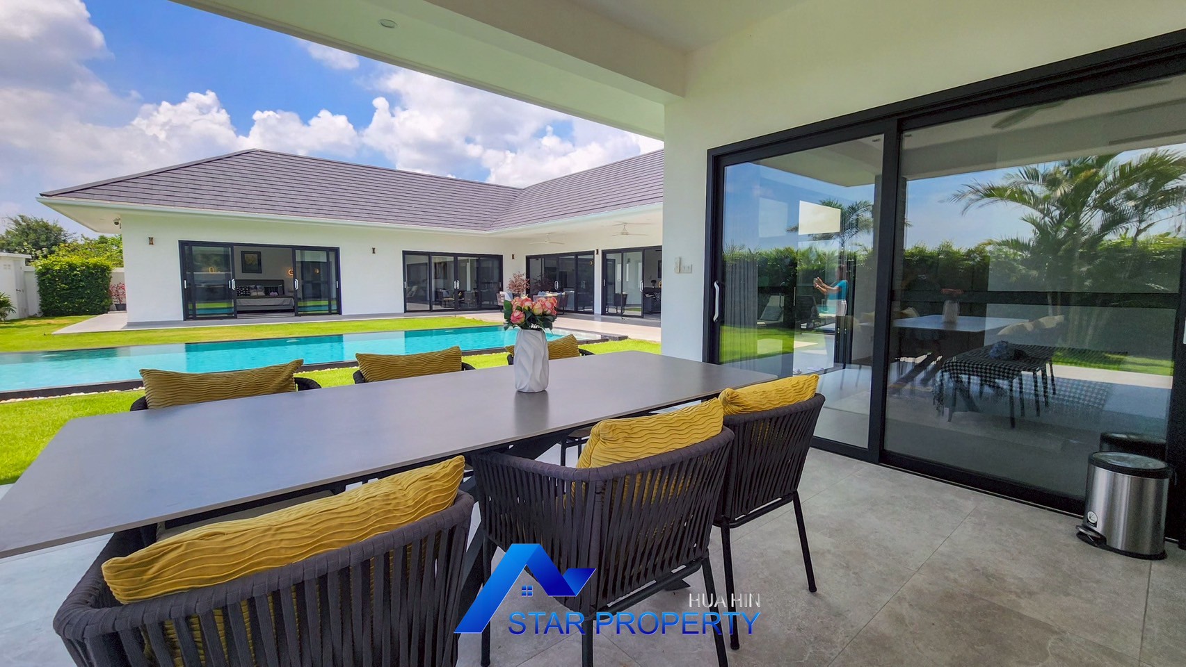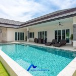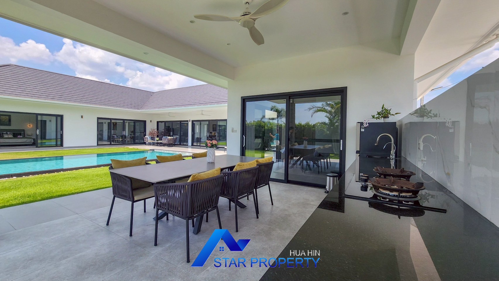 This new beautiful pool villa with 5 bedrooms 5 bathrooms complete with private garden and pool size 4.5*11 meter with salt system. The location at Hua Hin soi 70, 3 km from Black mountain golf course and 11 km from Huahin town. The villa offers top quality materials. Fully furnished and ready for immediate occupancy. Land area 808 sq.m (Title deed red color). Living area 300 sq.m. ,Laundry room and Storage room. Parking space for 2 vehicles, 4,000-liter water tank with water supplied from Pranburi. No common fees.