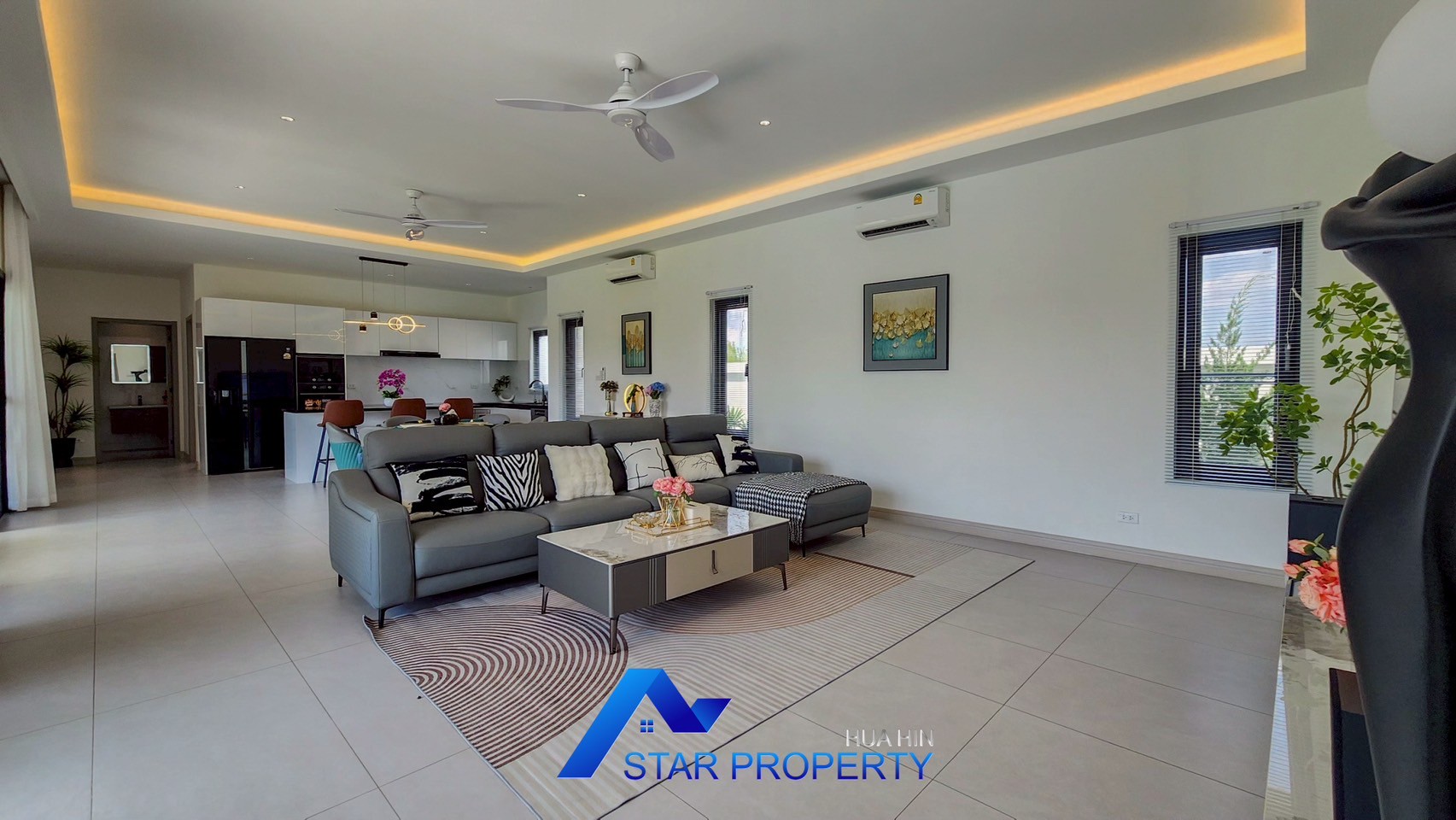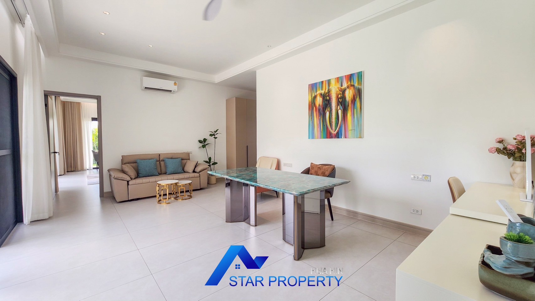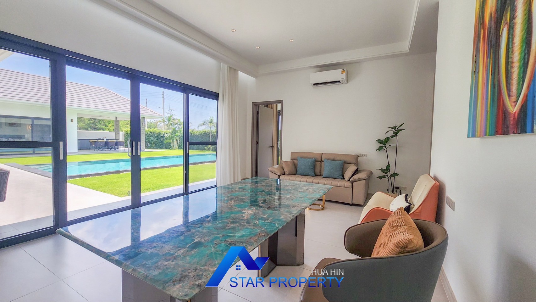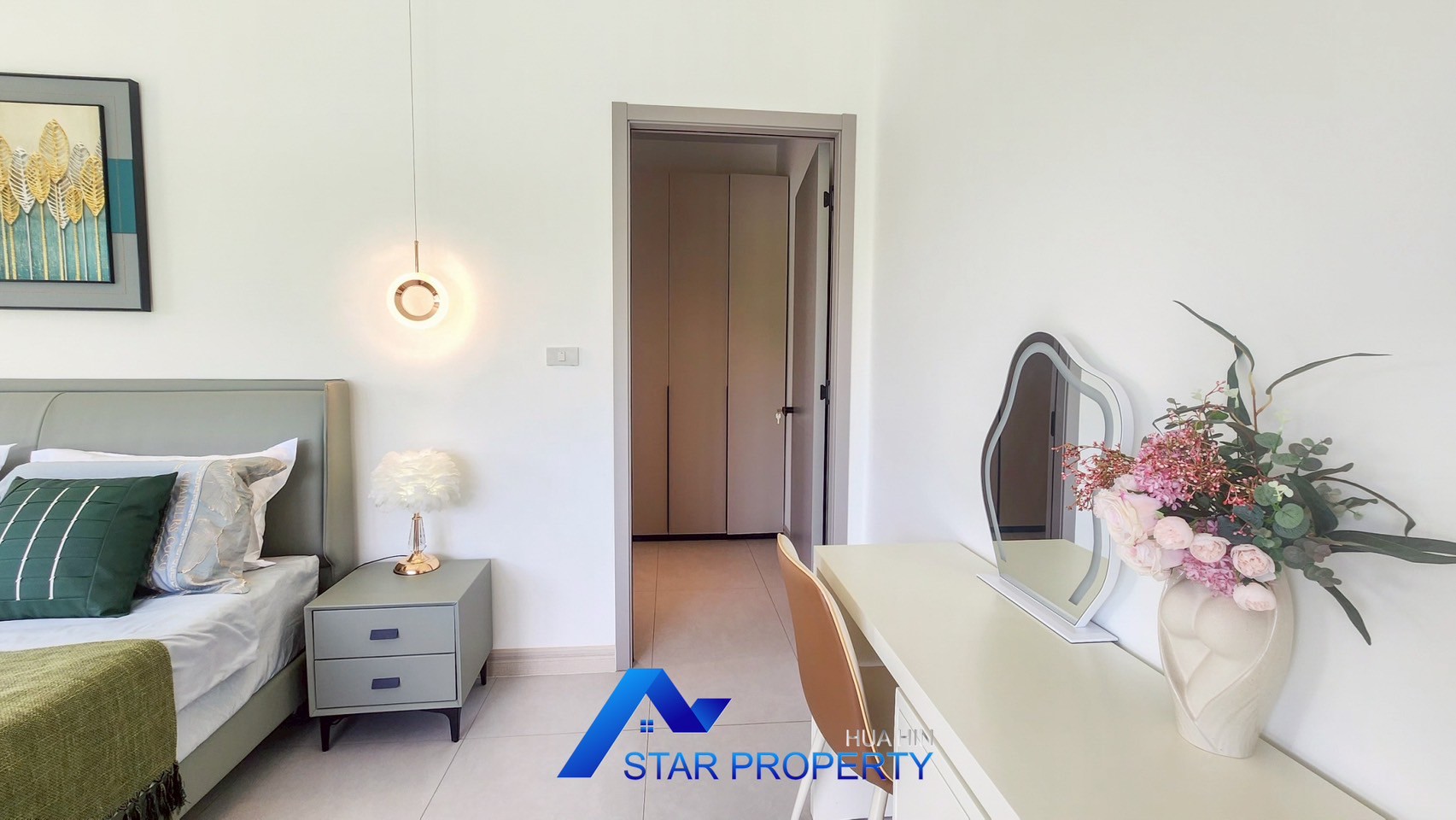 This new beautiful pool villa with 5 bedrooms 5 bathrooms complete with private garden and pool size 4.5*11 meter with salt system. The location at Hua Hin soi 70, 3 km from Black mountain golf course and 11 km from Huahin town. The villa offers top quality materials. Fully furnished and ready for immediate occupancy. Land area 808 sq.m (Title deed red color). Living area 300 sq.m. ,Laundry room and Storage room. Parking space for 2 vehicles, 4,000-liter water tank with water supplied from Pranburi. No common fees.