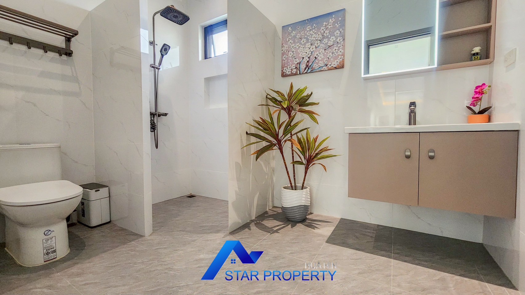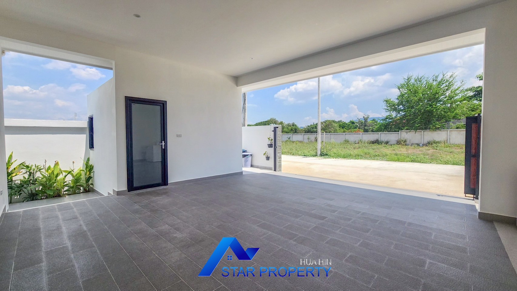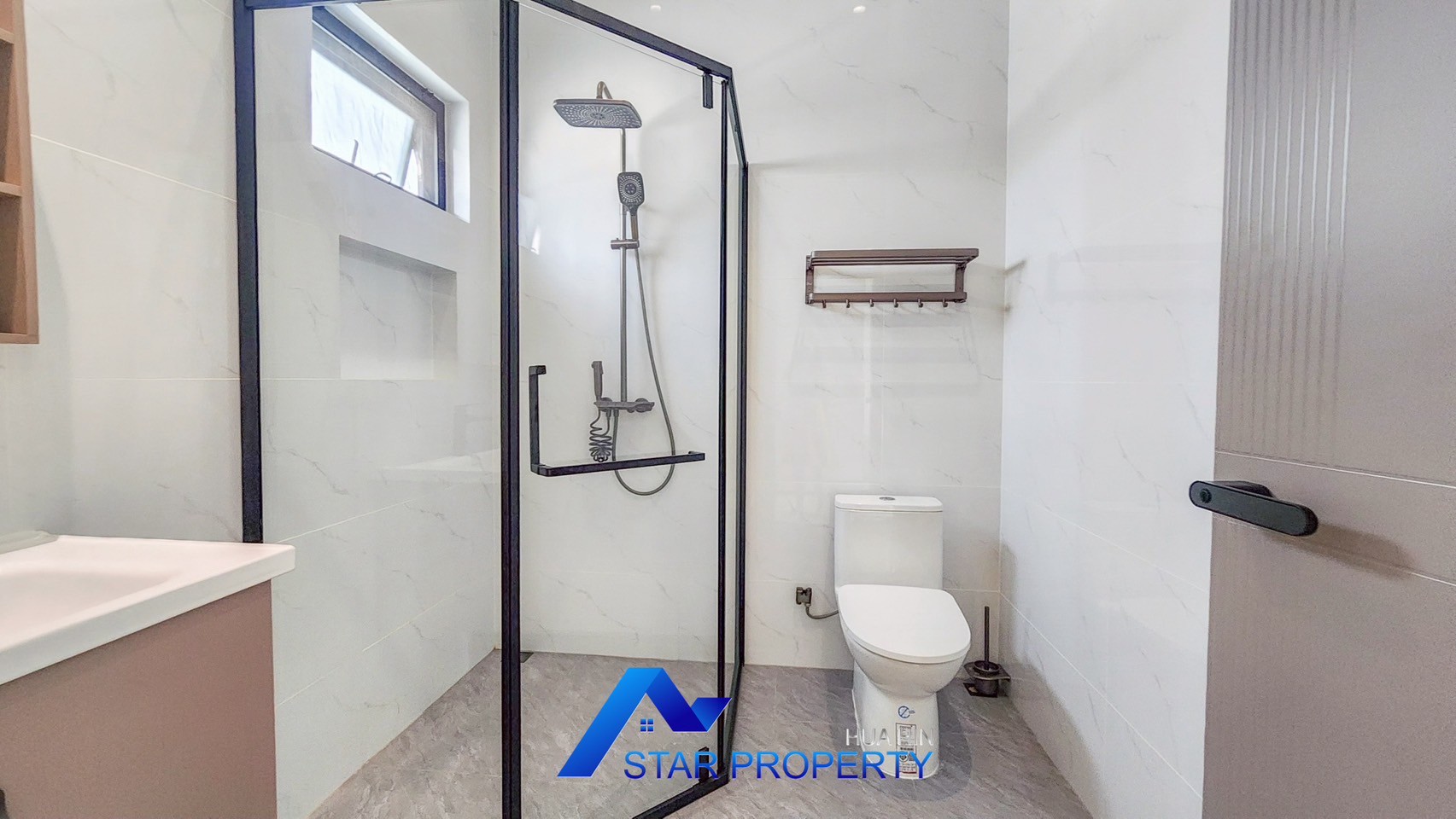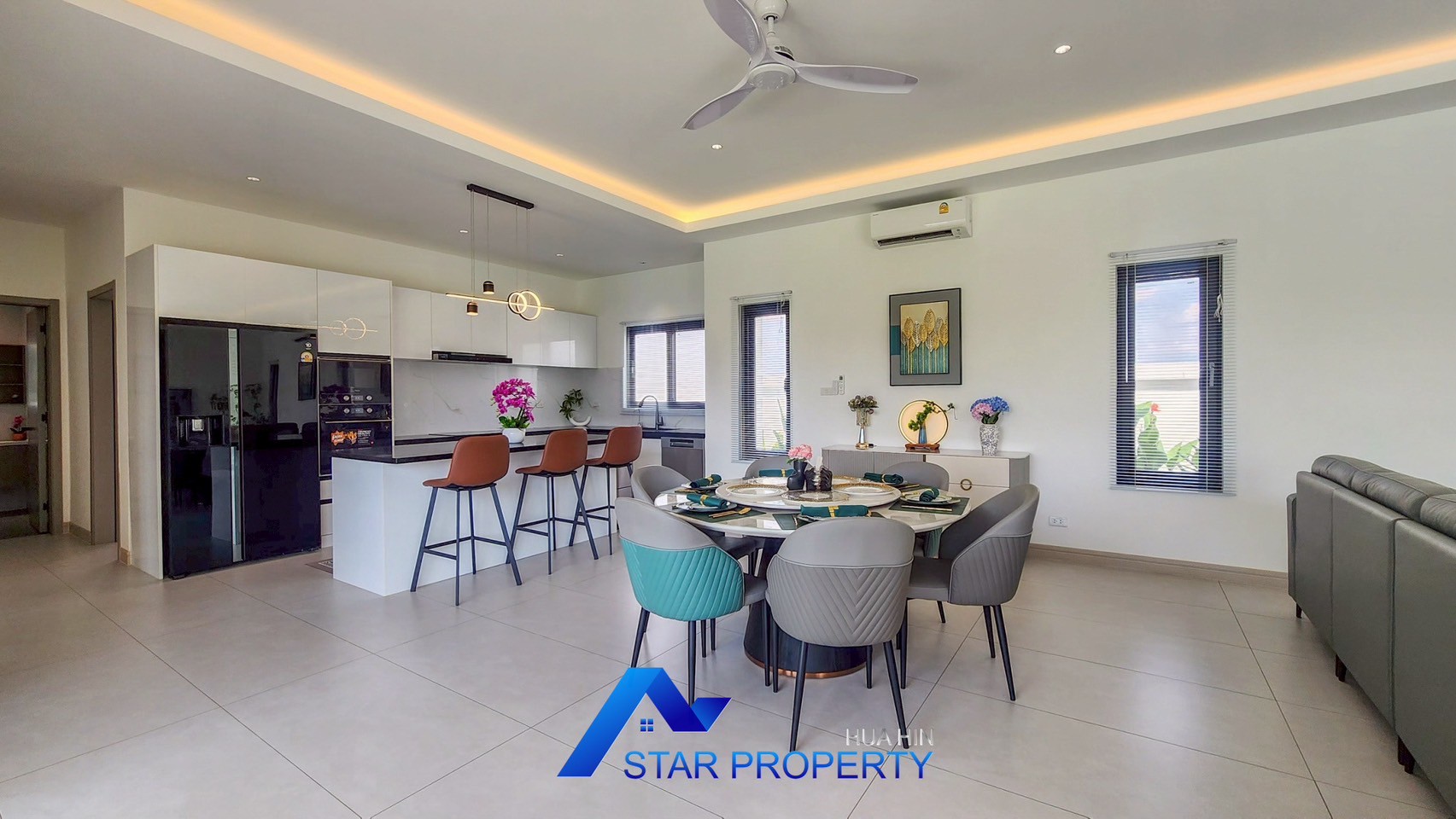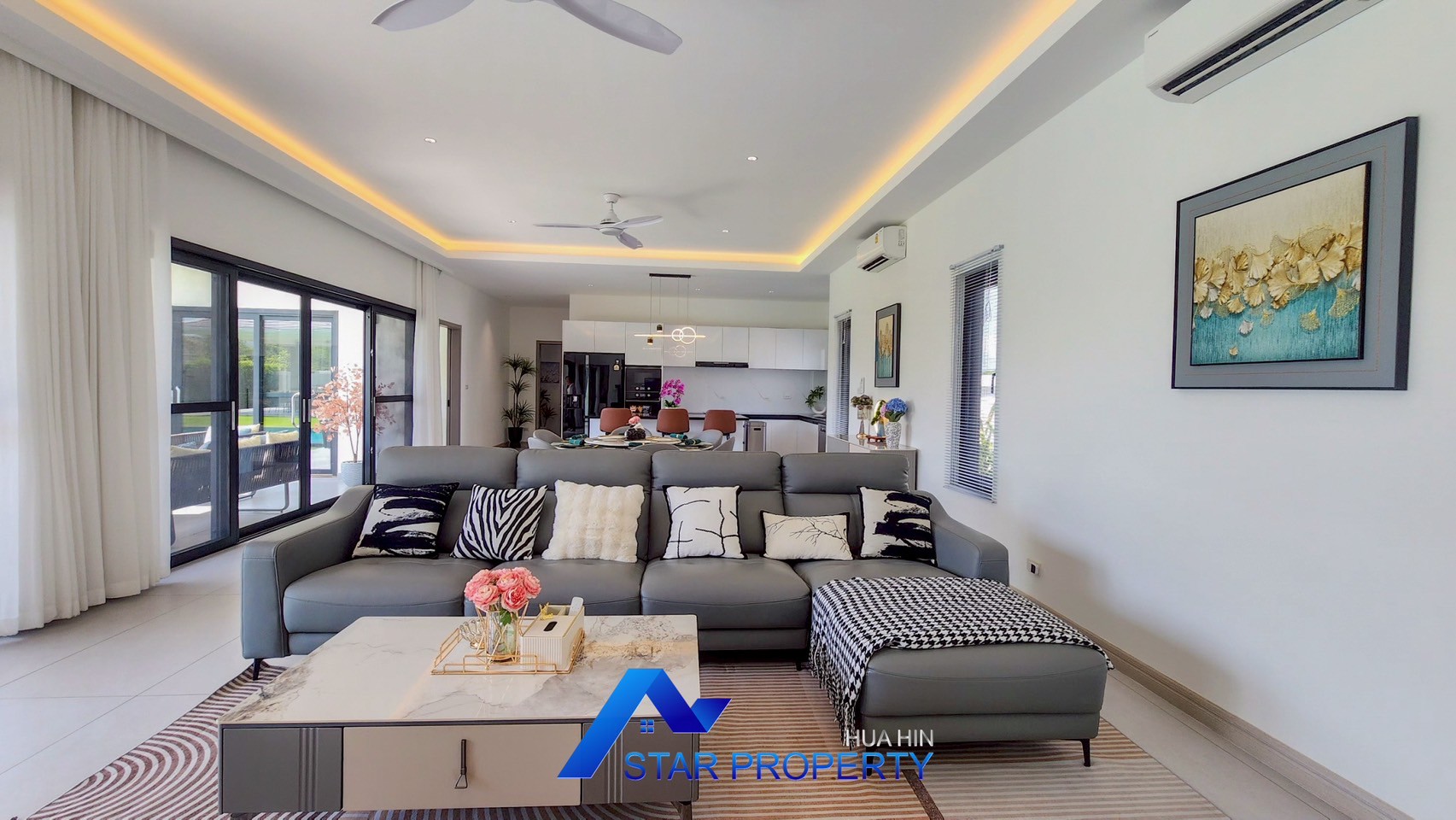 This new beautiful pool villa with 5 bedrooms 5 bathrooms complete with private garden and pool size 4.5*11 meter with salt system. The location at Hua Hin soi 70, 3 km from Black mountain golf course and 11 km from Huahin town. The villa offers top quality materials. Fully furnished and ready for immediate occupancy. Land area 808 sq.m (Title deed red color). Living area 300 sq.m. ,Laundry room and Storage room. Parking space for 2 vehicles, 4,000-liter water tank with water supplied from Pranburi. No common fees.
