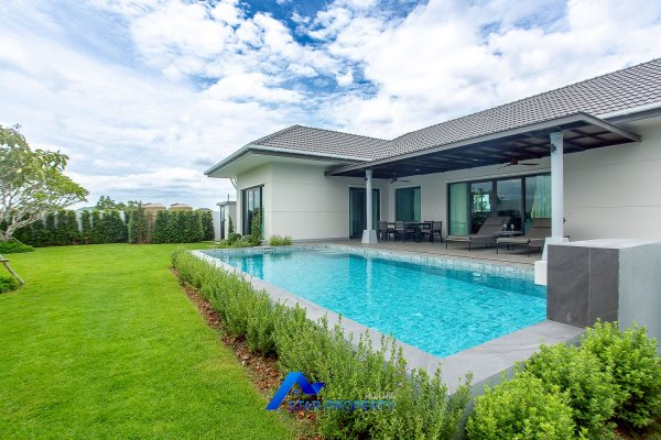 Nantra Residence is located in a quiet area of Thap Tai, Hua Hin, offering a luxurious single-storey villa experience amidst lush landscaped surroundings. The villa features contemporary architecture designed to blend in with nature, with beautifully manicured lawns and relaxing green spaces.