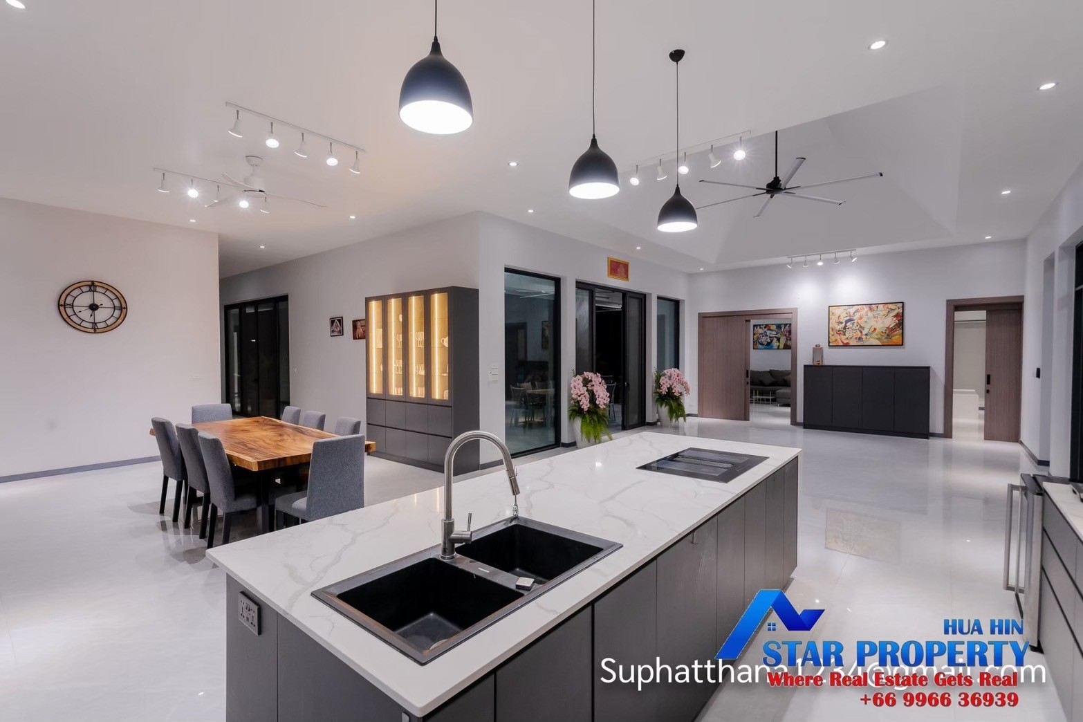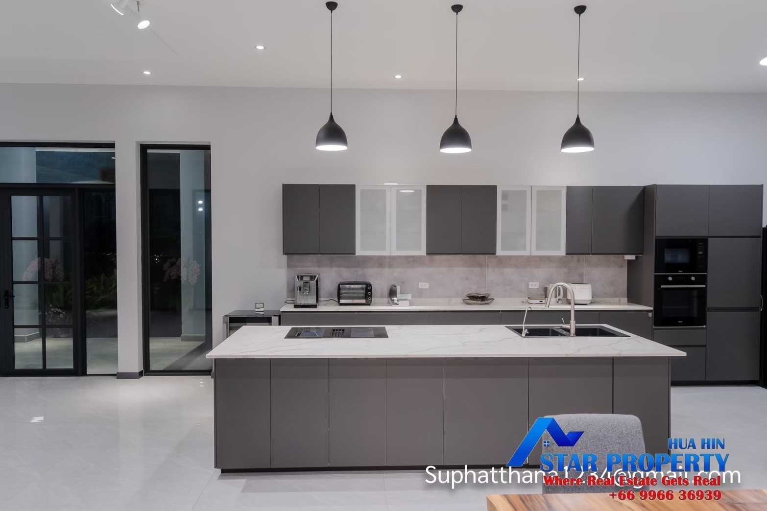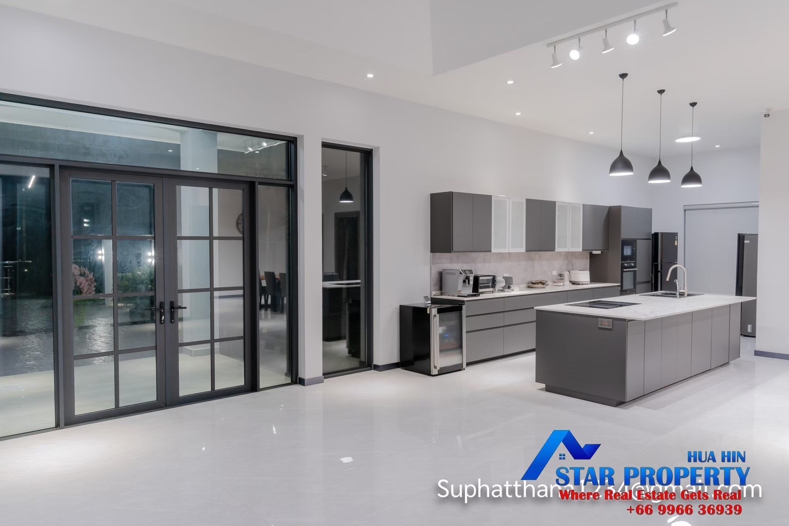 The land size 1.5 rais , The villa consist of 5 bedrooms with ensuite bathrooms and extra guest toilette , a large open kitchen and a specious dining area, in addition there is a TV/Karaoke room and an utility room. All in all almost 400 sqm. living space.  The kitchen offers much space , oven , micro wave . dishwasher , sink , induction stove top are integrated, the stove top is equipped with downdraft exhaust, the worktop is made of granite , 2 large refrigerators with freezer compartments ensure cooling.