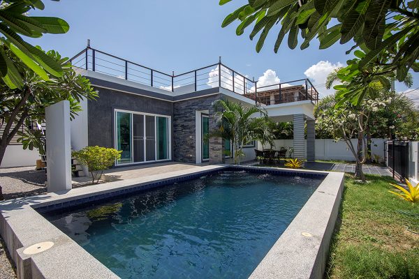 A very gorgeous single storey pool villa fully furnished comes with 3 private bedroom. 2 bathroom. 1 living area. 1 laundry room. 1 western kitchen inside the villa, 1 outdoor kitchen with an outdoor dining space next to the pool. 2 Parking space and a garden for your family.