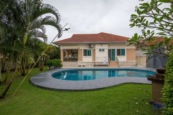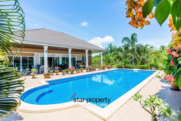 Stand-alone pool villa 2 bedrooms, 2 bathrooms, 1 office room can be fit into another bedroom and studio bungalow with bathroom and own kitchen for sale at Baan Nong Saw Hua Hin. The villa is located 30 minutes drive from Hua Hin to the west. On this land, you can plant many trees, fruits, vegetables, or anything you want to plant because it is spacious.